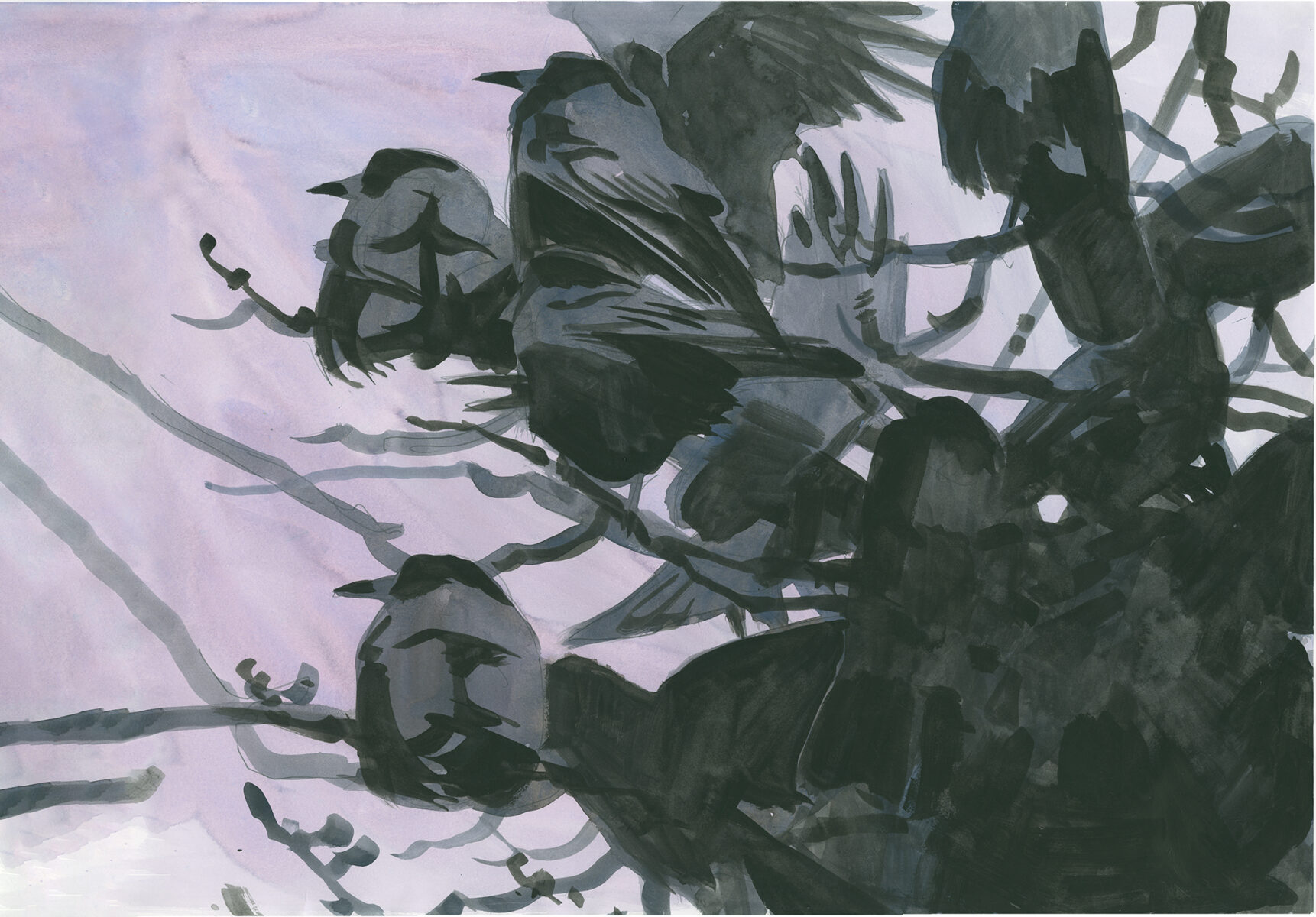« Raaaaaaa raaaaaah. » Un tumulte rauque couvre petit à petit le bruit de la ville et de ses habitants pressés. J’ai du mal à déceler d’où il provient exactement. Le ciel vire de gris argent à gris plomb. Les lampadaires éblouissants se reflètent sur du béton quasi lacustre. On ne discerne presque plus rien. Alors que les railleries se font plus proches, je devine une constellation de confettis sombres à travers les branches dénudées des arbres du parking. Je pourrais tout aussi bien y voir d’innombrables feuilles mortes à moitié consumées portées par les vents depuis un brasier infernal.