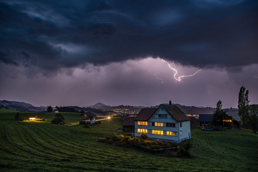 Mais le calme n’est qu’apparent. Depuis le début de l’après-midi, de gros choux-fleurs bourgeonnent sur la chaîne de l’Alpstein. Vers le sud, le ciel se teint de gris et de violet. Un cumulonimbus menaçant et à la base noirâtre dévale les montagnes. Dans ses entrailles, les cristaux de glace se frottent en chargeant le nuage électriquement. L’orage vient. Je rejoins le haut d’une colline aussi vite que possible mais aussi lentement que nécessaire – par temps orageux, il est en effet recommandé de faire des petits pas pour minimiser le risque de foudroiement.
