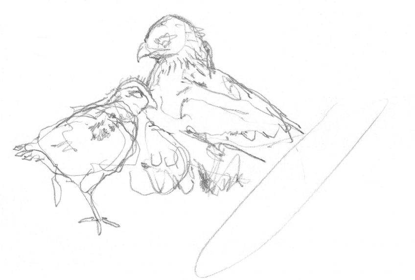 Au début, il n'y a guère de différence entre les trois jeunes, mais plus le temps passe, plus les deux aînés monopolisent les nourrissages. Maintenant, le cadet paraît presque chétif. La femelle a-t-elle conscience du drame qui se prépare ? Cherche-t-elle à l'éviter ? Ou à le provoquer ? En tout cas, il lui arrive d'écarter le plus gros poussin manifestement repu pour nourrir le plus petit.