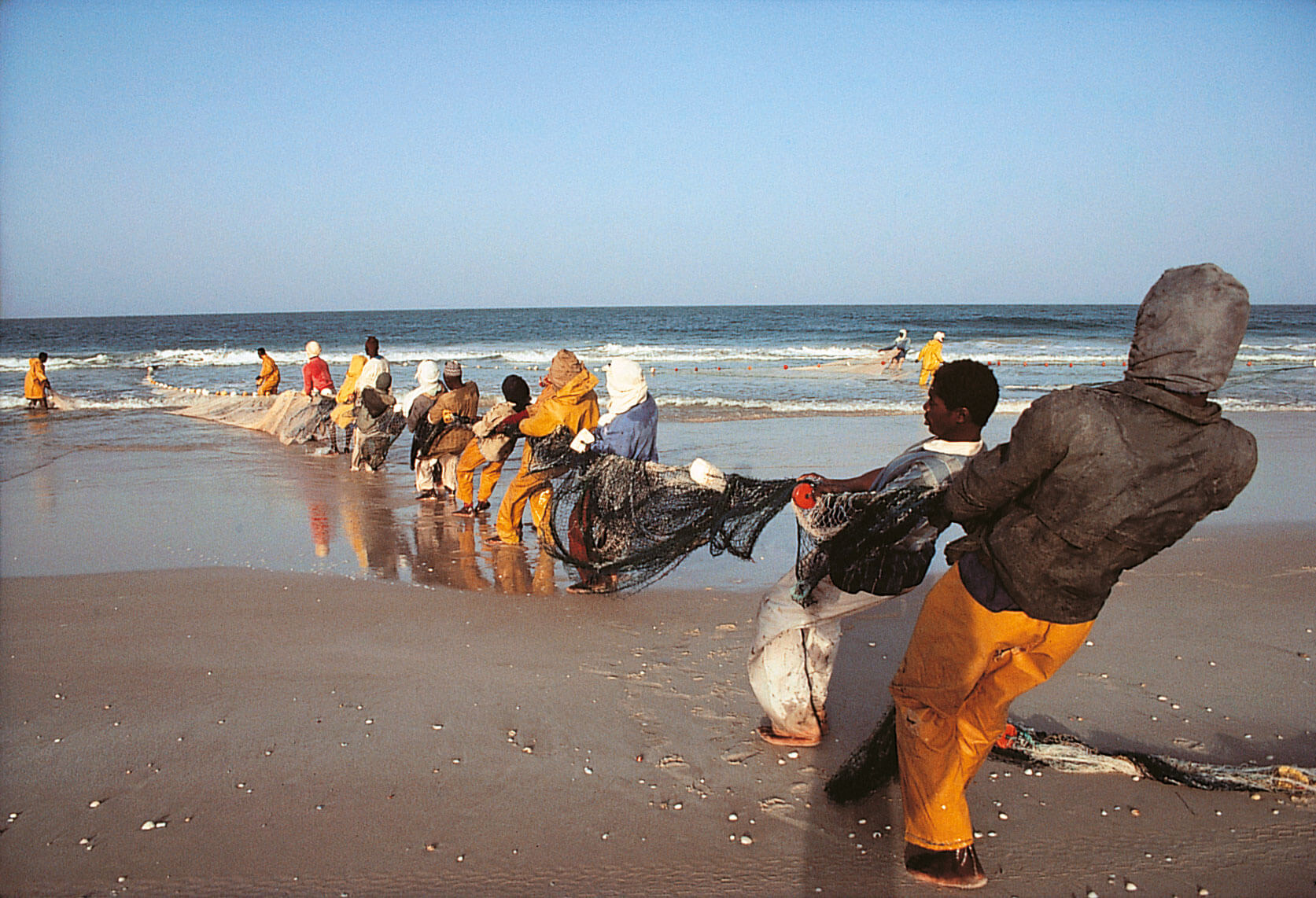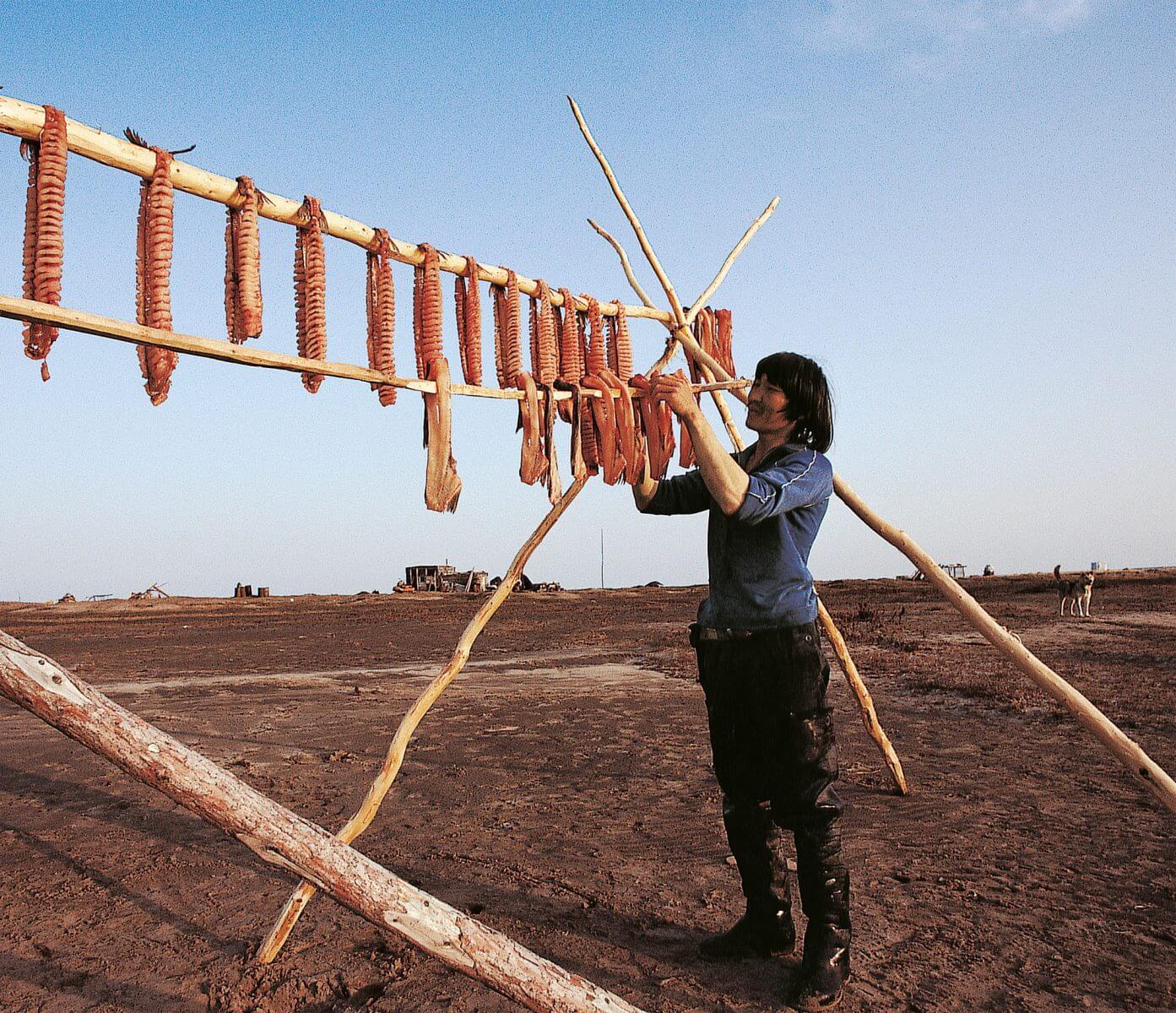 En Mauritanie, un pêcheur devant les mulets qui sèchent à l’air libre (ci-contre). En Sibérie, un pêcheur devant les saumons qui sèchent à l’air libre (ci-dessous).