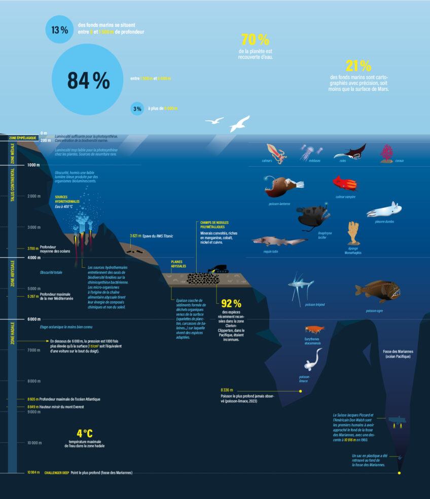 Les abysses sont le plus grand habitat sur Terre, en termes de volume et de surface. C’est aussi l’écosystème le moins connu de la planète. On a de meilleures cartes de la Lune et de Mars que du fond des océans. A chaque fois qu’on envoie des sondes explorer les fonds sous-marins, entre 70 et 90% des espèces prélevées sont nouvelles.