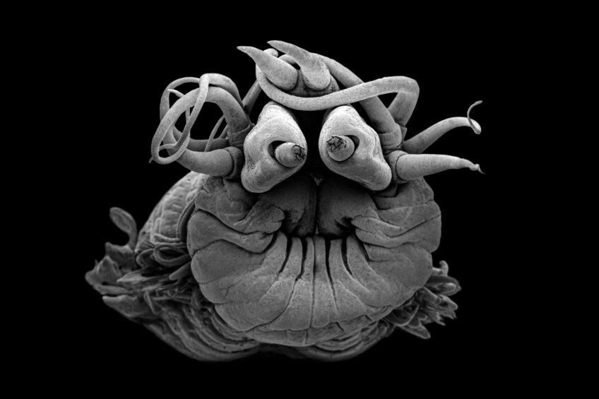Les bactéries permettent à Rimicaris exoculata de vivre ici. Cela se voit à sa tête, très enflée, très longue, qui lui donne un peu une allure de hamster : dans ses joues, que les scientifiques ont analysées en laboratoire, se trouvent des filaments microbiens où s’installent nombre de ces organismes, avec lesquels elle vit en symbiose. Rimicaris exoculata se nourrit des sucres, lipides et protéines produits par ses symbiontes – les bactéries qui ont besoin d’elle pour vivre et se développer – à partir des composés chimiques présents dans les fumées venant de la roche en fusion. C’est le fameux procédé de chimiosynthèse, auquel on doit, au passage, l’apparition de la vie sur Terre. Ainsi, 70 % de la nutrition de cette crevette des abysses provient de ses bajoues !