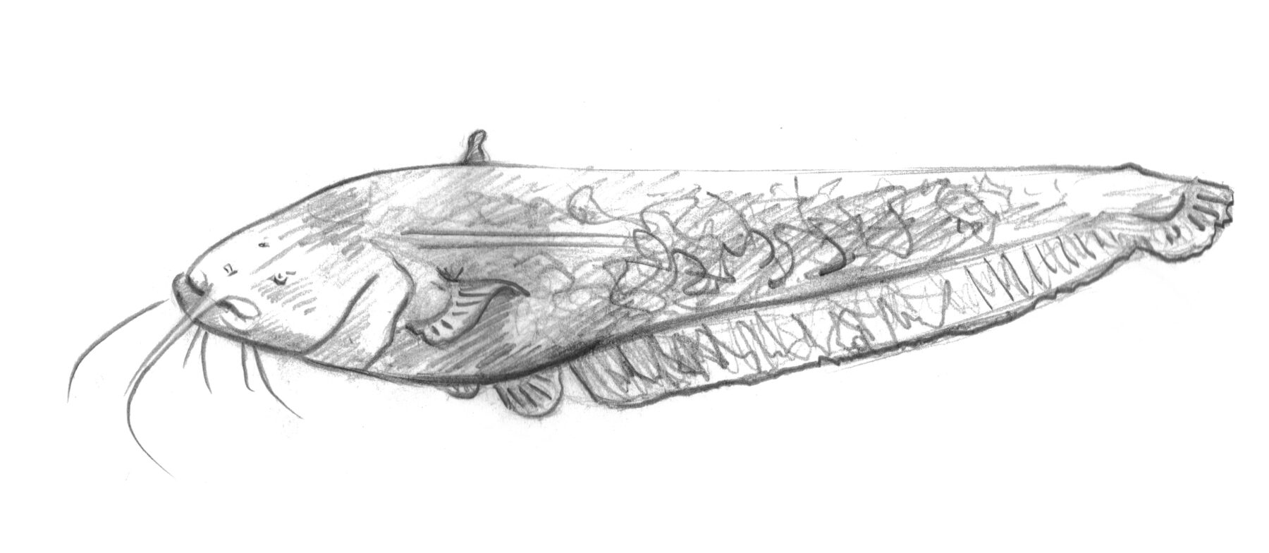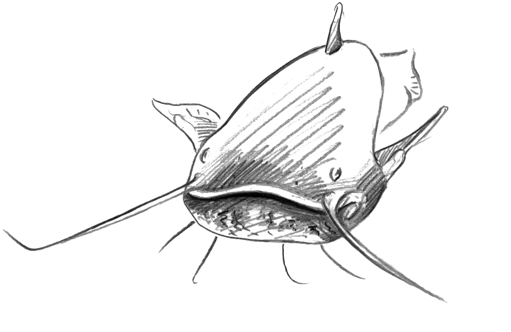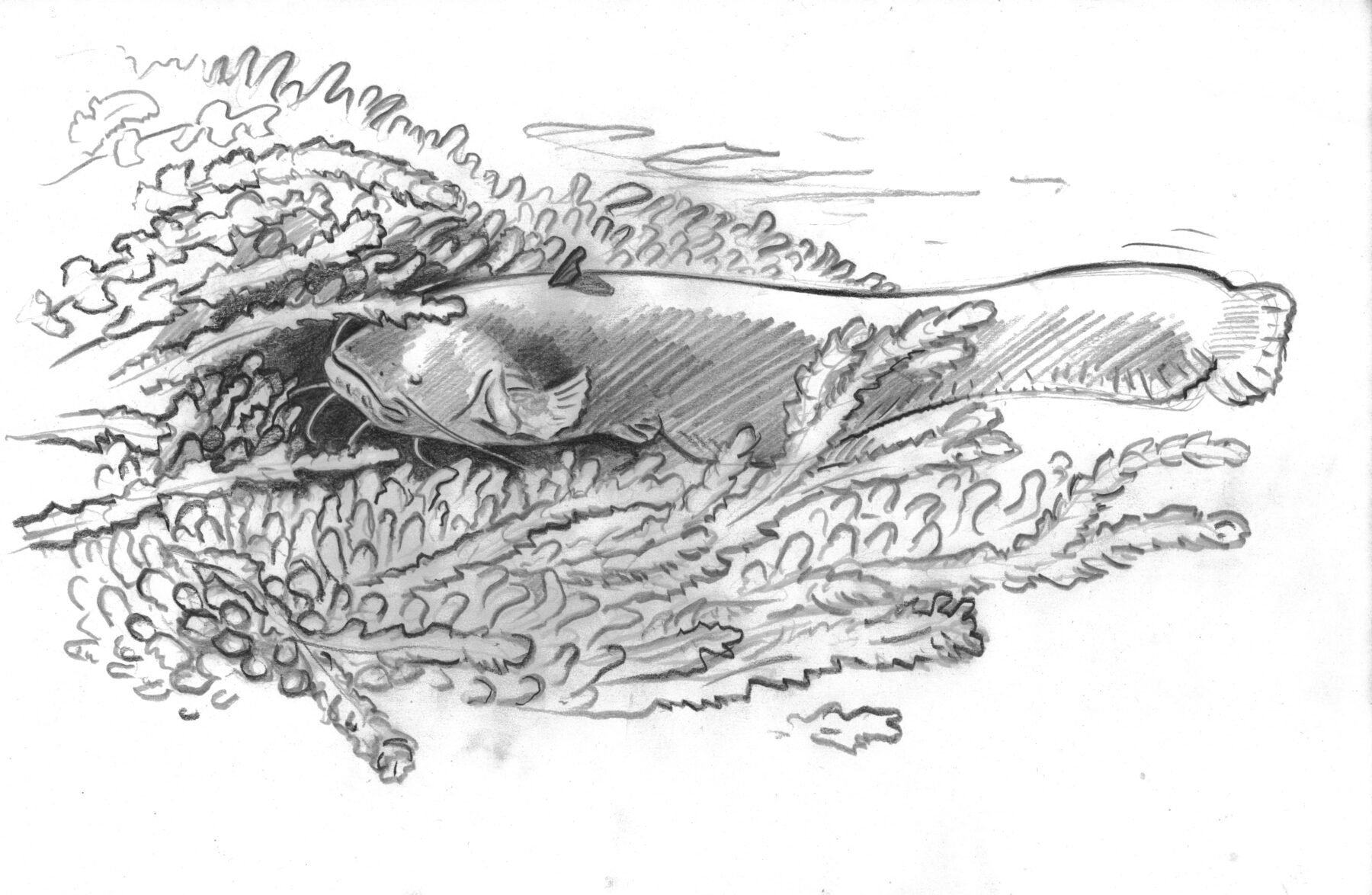 Perdu dans mes pensées, je remarque soudain une grande silhouette noire qui nage en dessous de moi. Large tête, long corps effilé vers l’arrière… Aucun doute, un second silure, et il a l’air gros. Je descends à son niveau et me rapproche lentement, jusqu’à passer à côté de lui. Il est plus grand que moi ! Curieux, il vient à ma rencontre et m’examine. J’ai beau savoir que je ne risque rien, ce face-à-face est tout de même impressionnant. Il s’approche si près que je peux voir les innombrables dents minuscules alignées le long de sa mâchoire entrouverte. Ses mouvements sont d’une grâce étonnante, il est ici dans son élément. Nous dansons silencieusement l’un autour de l’autre, jusqu’à ce que mes poumons me rappellent ma condition d’espèce terrestre. Je salue mon compagnon puis remonte en vitesse.