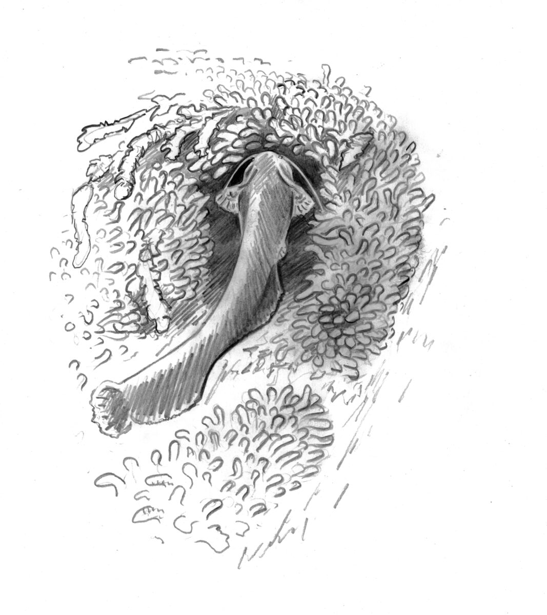 Pour l’instant, il ne bouge presque pas. Seules ses nageoires battent lentement pour maintenir sa stabilité dans le faible courant. Il attend la tombée du jour pour se mettre en chasse (> Gargantua ?). Ma présence semble toutefois troubler son repos, il s’éloigne en ondulant gracieusement son long corps marbré de noir et de gris. Je n’insiste pas et poursuis mon exploration.