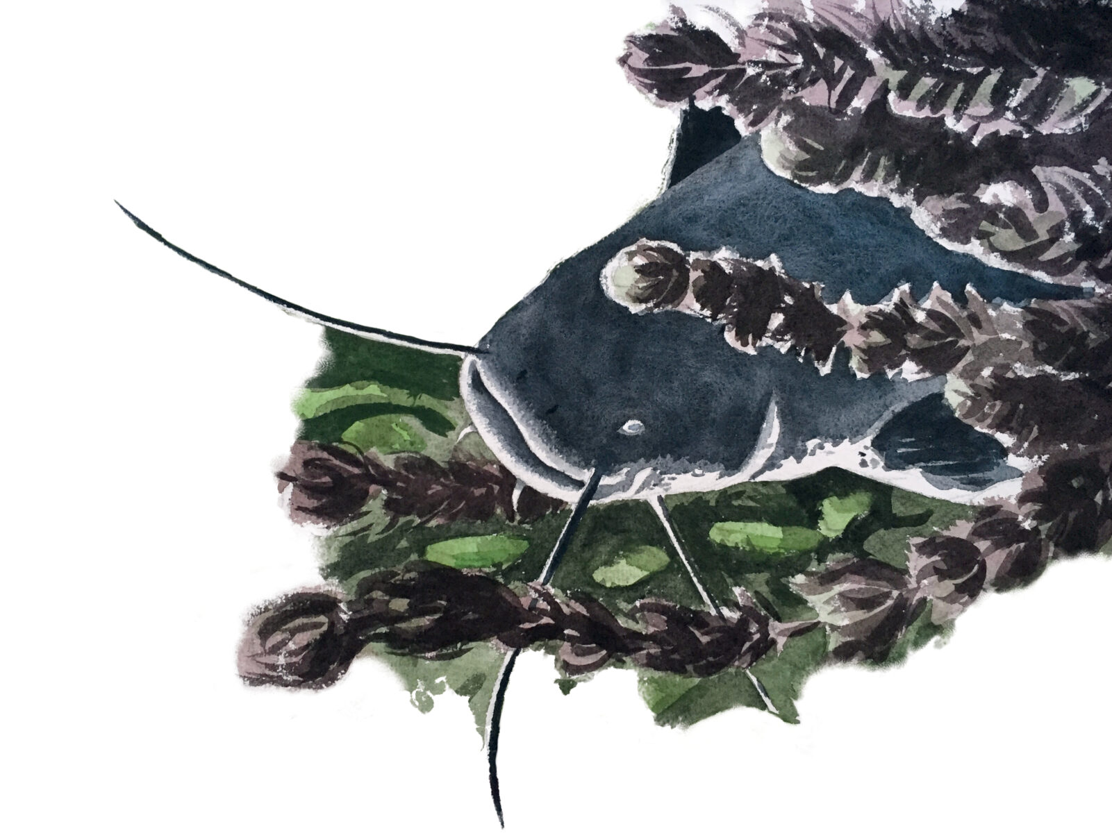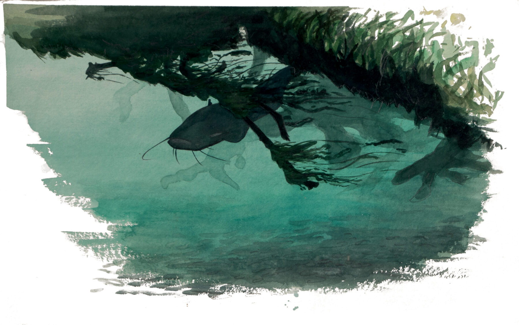 Soudain, j’aperçois une longue forme sombre qui se faufile entre les potamots. Je m’approche. C’est lui ! En quelques coups de palmes, je me retrouve face à un silure de 1,20 m de long. Un bel individu, mais pas encore un géant. Ses yeux paraissent minuscules par rapport à sa grosse tête plate. Prédateur nocturne habitué aux eaux troubles, le silure ne compte pas sur sa vue pour se diriger ou se nourrir. Il utilise davantage ses longs barbillons, toujours en mouvement. Recouverts d’une multitude de récepteurs sensoriels, ils lui permettent de tâter son environnement et de « goûter » l’eau, comme un odorat subaquatique. Très pratique pour repérer ses proies, même cachées dans la vase.