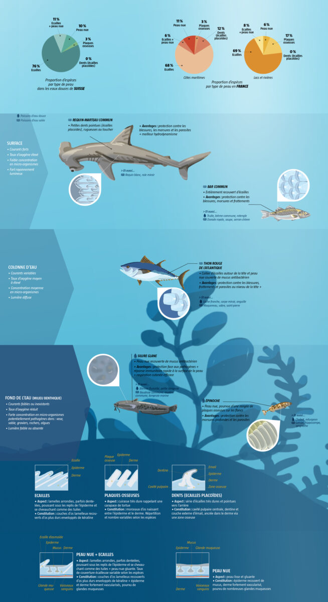 Non, les poissons ne sont pas tous couverts d’écailles ! Leur peau peut être nue, équipée d’une cuirasse osseuse ou recouverte de sortes de dents. Des enveloppes parfaitement adaptées aux contraintes de leur habitat, en mer comme en eau douce, à toutes les profondeurs.