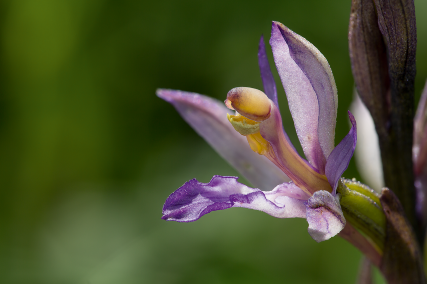 Ressemblant étrangement à une orobanche, la limodore à feuilles avortées partage avec cette plante non chlorophyllienne le même travers : c’est un parasite. Eh oui, la limodore vit aux crochets d’un champignon, mais fait au moins l’effort de pratiquer un peu la photosynthèse. Comment lui en vouloir ? Elle est pratiquement au chômage technique, il y a si peu de lumière dans son sous-bois. Dans le genre collante, on peut citer sa cousine la néottie nid d’oiseau, qui elle ne s’essaie même pas à l’exercice photosynthétique. Malgré son allure à première vue peu aguicheuse, la néottie arrive quand même à attirer des diptères. Elle leur collera ses pollinies agrémentées d’une goutte visqueuse.