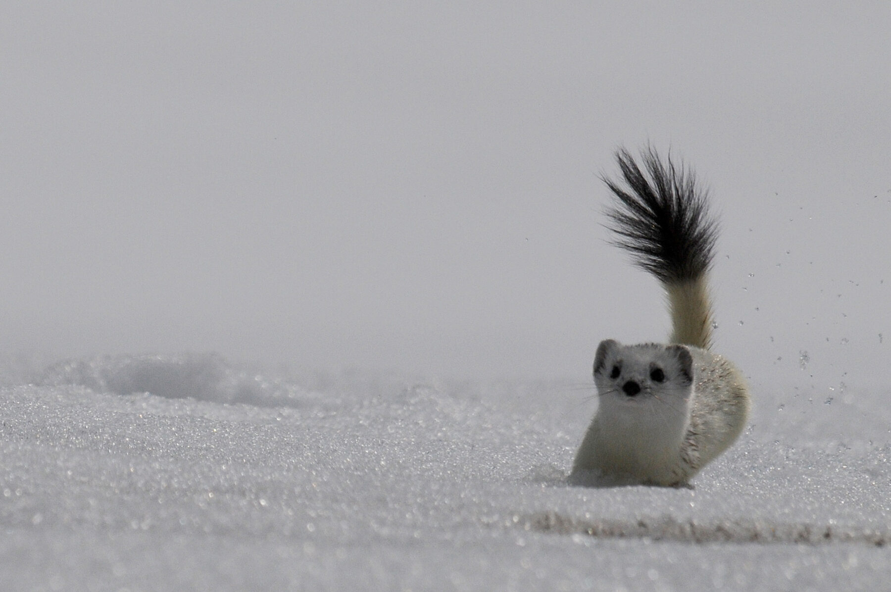 L'hermine est aussi impressionnante par son changement de pelage au fil des saisons. "Au printemps elles sont ombragées, puis elles deviennent toutes brunes en été. En automne, la transition vers le pelage tout blanc de l'hiver s'opère. Je les trouve très belles en hiver, le fait qu'elles soient en accord avec la neige. En plus, leurs petits yeux, leur truffe et leur queue au bout noir ressortent si bien sur la neige blanche !"