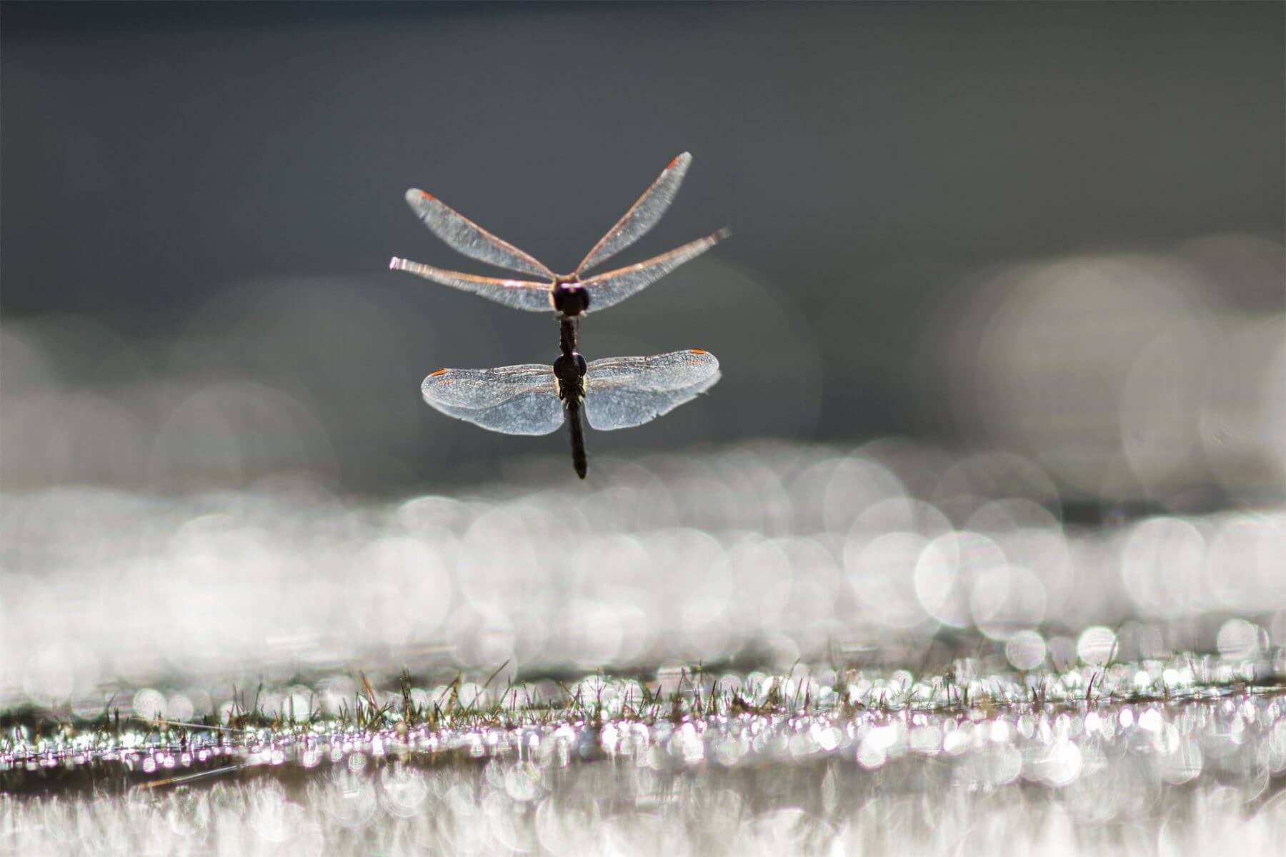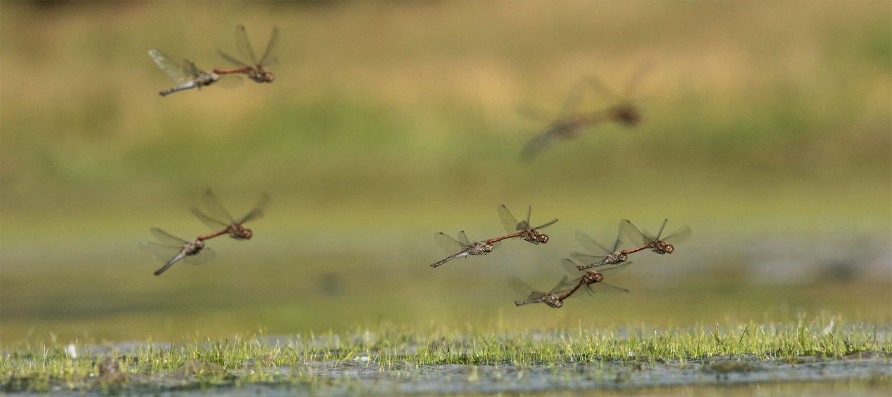 Un premier couple survole la piste et descend en rase-mottes. S’élève à nouveau et reprend son vol de reconnaissance, puis se décide : c’est sur cette petite butte de vase qu’il faut pondre. Tenue à la nuque par le mâle, la femelle frappe la boue rythmiquement avec la pointe de son abdomen en déposant chaque fois quelques œufs. Mais déjà le tandem sort du cadre, dérangé par des congénères. Quand je relève les yeux du viseur, une dizaine de couples oscillent autour de moi. Parfois, ils sont plus d’une centaine !