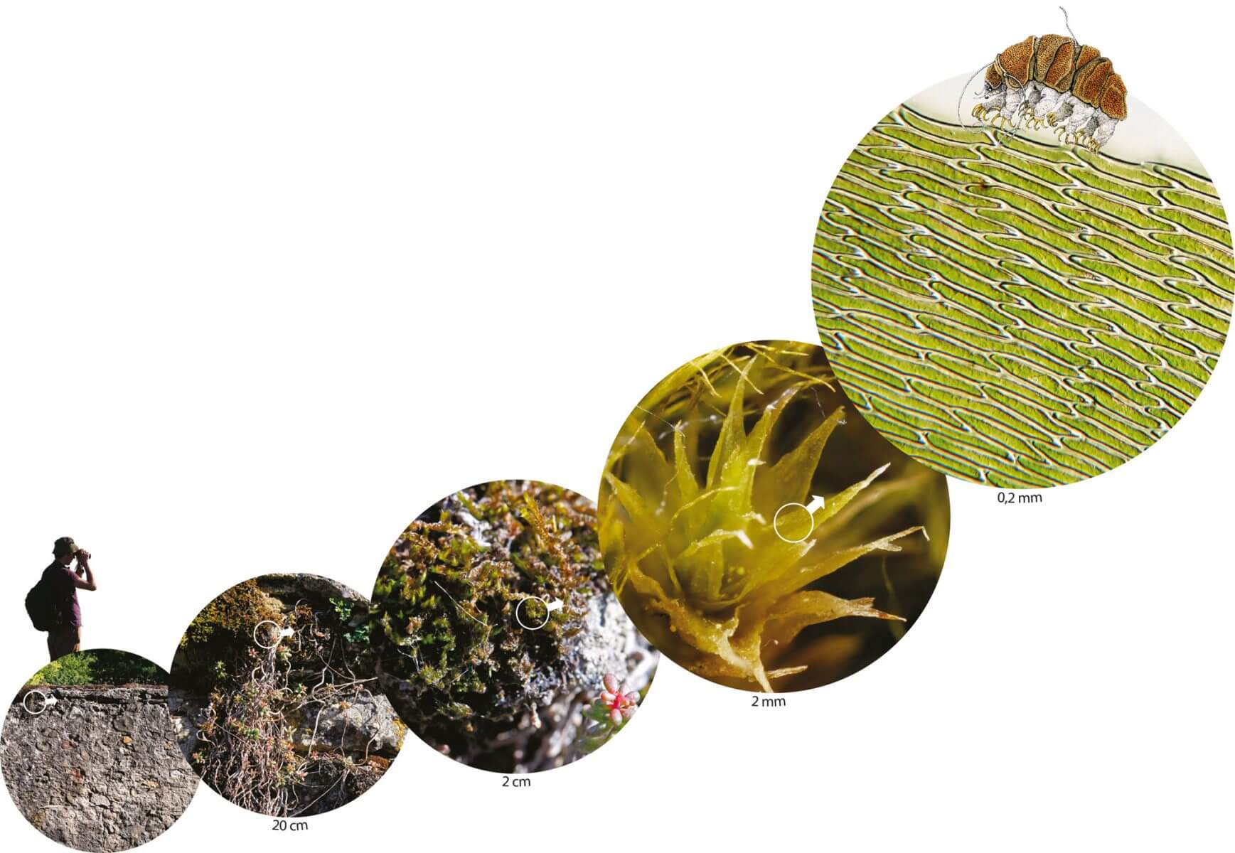 Une simple loupe grossissant de 5 à 10 fois permet de démarrer l’exploration d’un coussin de mousse. On y trouve parfois de petits escargots, des limaçons, des cloportes et surtout des acariens et des collemboles, représentants typiques de la faune des sols et de la litière. Contrairement aux créatures minuscules qui vivent entièrement dans un film aquatique, ces géants ont une respiration terrestre. Ils apprécient l’humidité, mais craignent la noyade tout comme le dessèchement. Plus leur habitat subit d'alternances marquées entre les deux extrêmes, moins nombreux on les y retrouve.