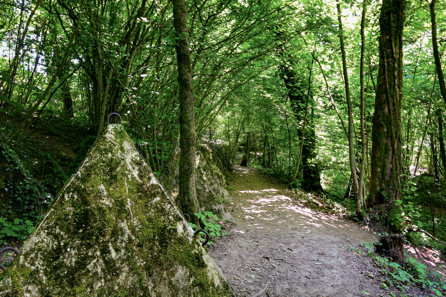 Pas moyen de les manquer, les fameux triangles de béton surnommés Toblerones en référence au célèbre chocolat se dressent en plein milieu du sentier. Il faut parfois même les enjamber pour continuer son chemin. « Nous sommes sur une ancienne ligne de défense antichar construite entre Bassins et Nyon durant la Seconde Guerre mondiale, précise mon guide. On en trouve au moins 3 000, étroitement répartis sur une distance de 10 km du pied du Jura jusqu’au lac Léman. »