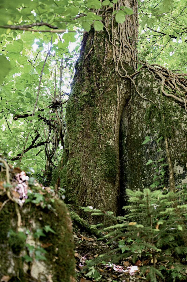 Par endroits, le foisonnement de la végétation est tel que ces drôles de monticules verts se fondent totalement dans le décor forestier. Certains arbres prennent appui sur les blocs, l’écorce englobant le béton. D’autres s’en servent de piédestal et trônent au sommet. Parfois, c’est la clématite qui a pris le dessus, ses longues lianes dessinant un circuit de courbes qui n’en finissent plus. Mon œil s’arrête également sur des prêles. Ces plantes aux tiges droites très graphiques forment ici ou là un tapis de verdure sur ces anciens ouvrages.