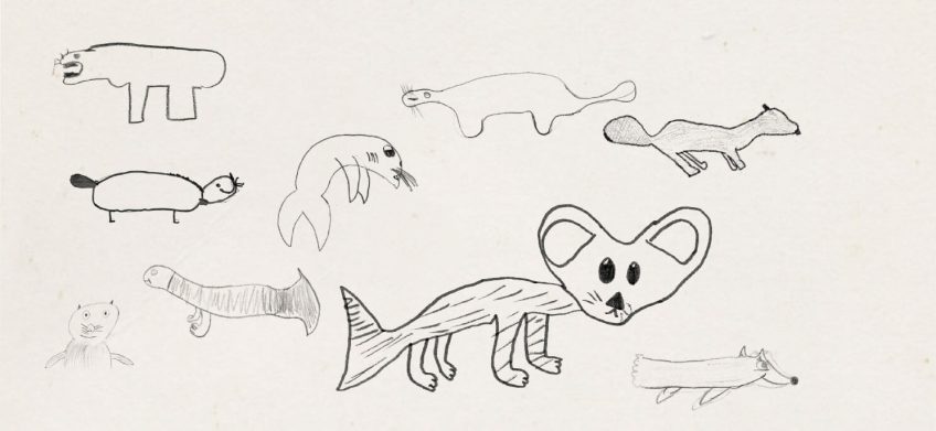 En Suisse, dans le Jura bernois, point de loutre franchement reconnaissable dans les dessins. Pareil en Franche-Comté. Tout au plus devine-t-on parfois la silhouette issue d’un documentaire animalier d’un phoque, d’une otarie, voire de l’exotique loutre de mer du Pacifique nageant sur le dos. Certains dessinent plutôt une sorte de castor, de dauphin ou un animal bizarre.