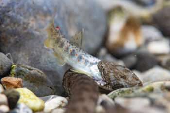 Ce jour-là, tout est allé très vite. Alors que je repère la silhouette d’une couleuvre vipérine en pleine action dans les quelques centimètres d’eau de l’adoux, celle-ci se dissimule presque aussitôt sous une pierre. Je me positionne pour déclencher dès sa sortie, quand le reptile réapparaît avec un petit poisson dans la gueule. Je n’identifie pas la proie tout de suite, je profite d’abord de la scène incroyable qui se déroule sous mes yeux. En quelques secondes, la proie qui s’avérera être une truitelle de moins de 10 cm est avalée par la tête. Magique…