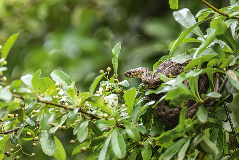 Dans ce petit paradis peuplé de castors, cincles et autres écrevisses à pattes blanches, la rencontre que j’espère aujourd’hui est celle d’une couleuvre vipérine. Un serpent dans l’eau ? Eh oui, à l’instar de la couleuvre à collier helvétique, la vipérine chasse en nageant. Mais si la première apprécie particulièrement les eaux calmes et les mares à la recherche d’amphibiens, la seconde évolue volontiers dans le courant, où elle chasse les poissons.