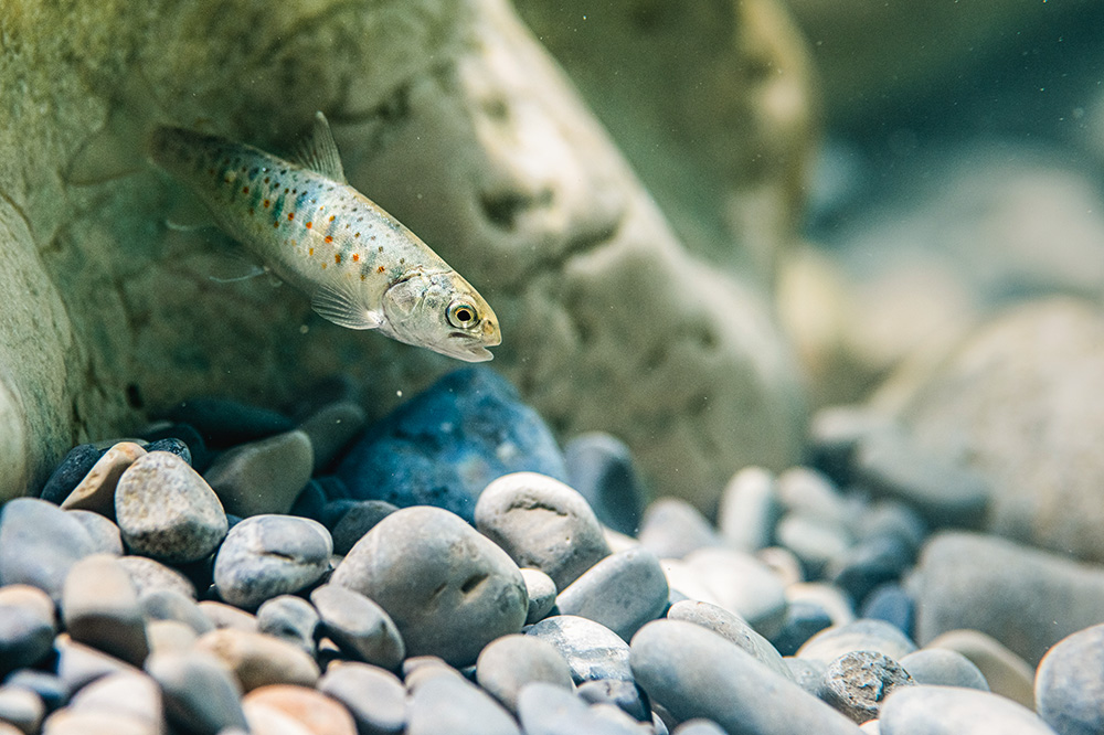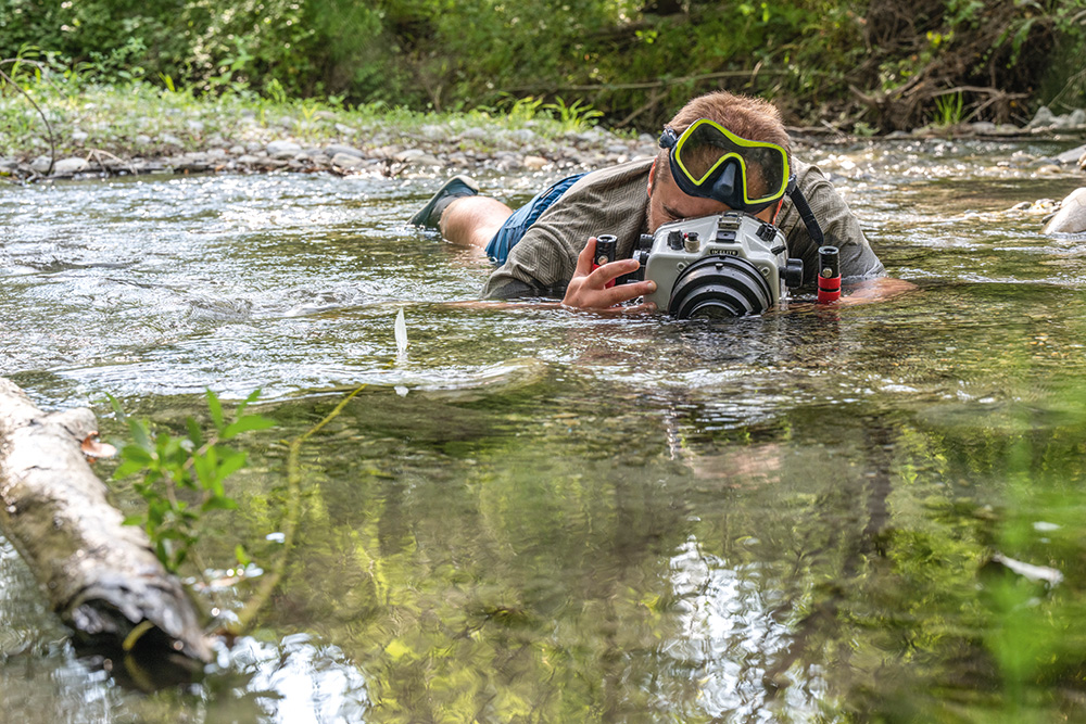 Je prospecte lentement en repérant à vue le moindre mouvement sous la surface. Dans la photo subaquatique, pas question d’affût fixe à attendre qu’un animal passe. Je chemine dans le courant en remontant la rivière. Une technique pour que les perturbations créées par mes pas sur le sédiment s’écoulent derrière moi et ne troublent pas l’eau que je scrute… Autre règle d’or, je fais très attention où je marche pour respecter les microhabitats précieux que je traverse. Une précaution qui implique d’avoir le regard porté juste à ses pieds tout en scannant quelques mètres devant.
