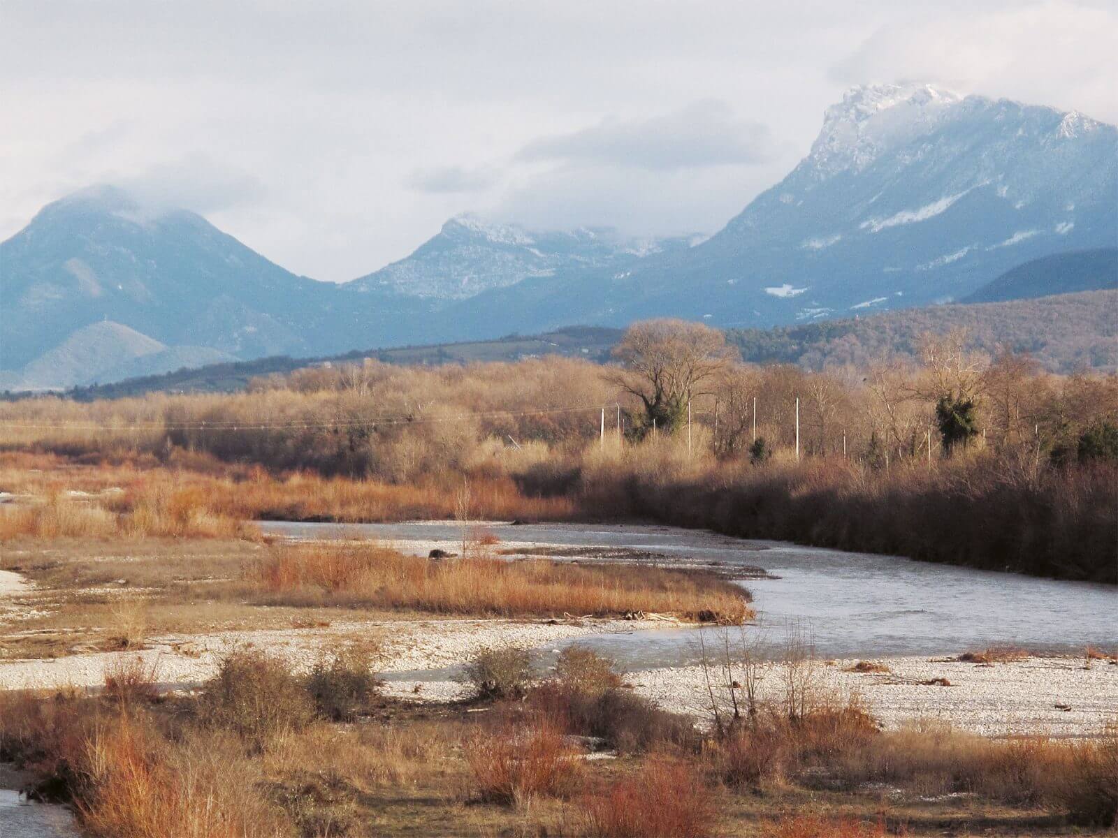 Un ruban d'eau tranche dans cette étendue. Sa couleur hésite en hiver entre le gris et l'émeraude. Son chemin divague en de multiples bras qui se divisent puis se rejoignent. Les méandres serpentent en amples virages, comme pour mieux s'attarder dans leur lit confortable. Le cours de la rivière a été modifié par endroits : on a tenté de la maîtriser par des digues rectilignes. Mais la Drôme s'échappe vite de cet étau : les hommes n'ont jamais vraiment pu dompter l'orageux caractère de l'insoumise, née des montagnes du Diois et du Vercors.