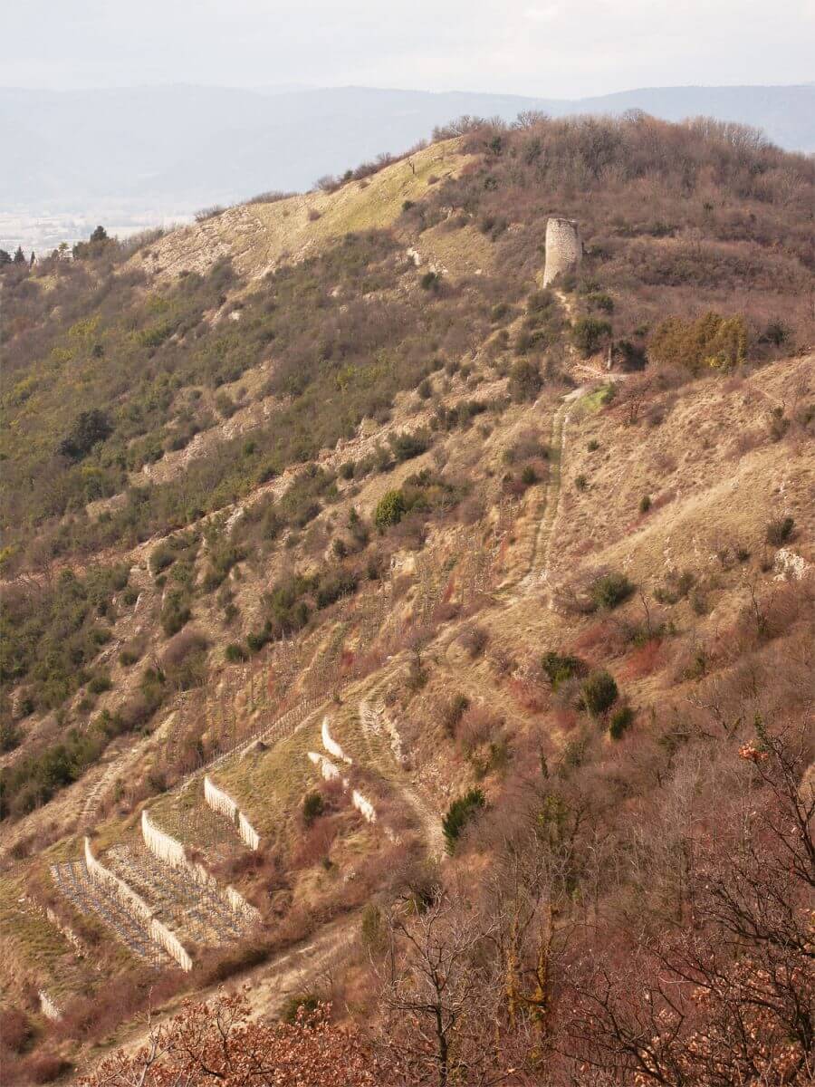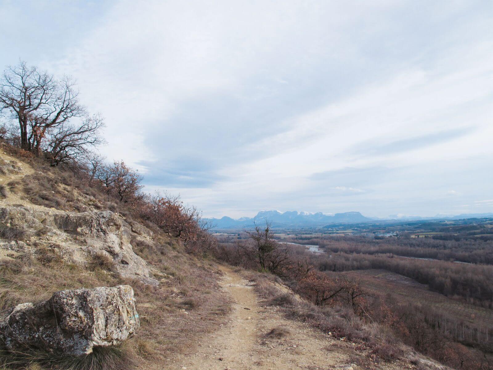 Pour contempler la vallée de la Drôme, qui s'étend au sud-est de Valence, l'idéal est de prendre de l'altitude. Sur le dos du coteau de Brézème, on chemine dans une végétation aux accents méditerranéens. Même sèche et dépouillée, la lavande froissée dégage son pénétrant arôme. Bordée de montagnes poudrées de neige, la plaine en contrebas prend des allures désolées.