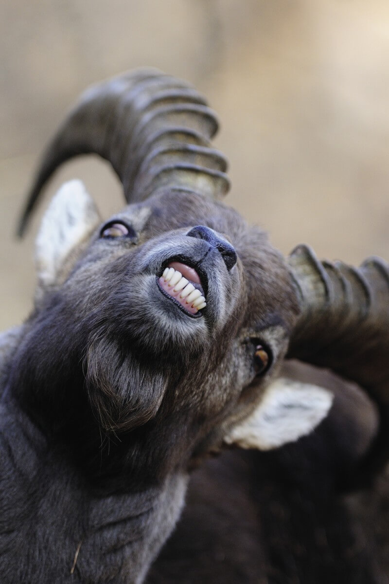 A cette époque de combats, le bouc semble perdre la raison. Il frotte ses grosses cornes contre rochers ou mélèzes et tout prétexte est bon pour se battre. Il ne prend pratiquement pas la peine de se nourrir et survit grâce aux graisses accumulées en été. Au maximum de son excitation, il suit les étagnes pas à pas en grognant, langue noire frétillante, cornes rabattues sur son dos, queue relevée. Parfois même, on peut voir sa verge rouge en érection. Pourquoi fronce-t-il les lèvres ? Pour savoir si la femelle est fertile, il canalise ses odeurs vers une structure située entre la bouche et le nez : l’organe de Jacobson.
