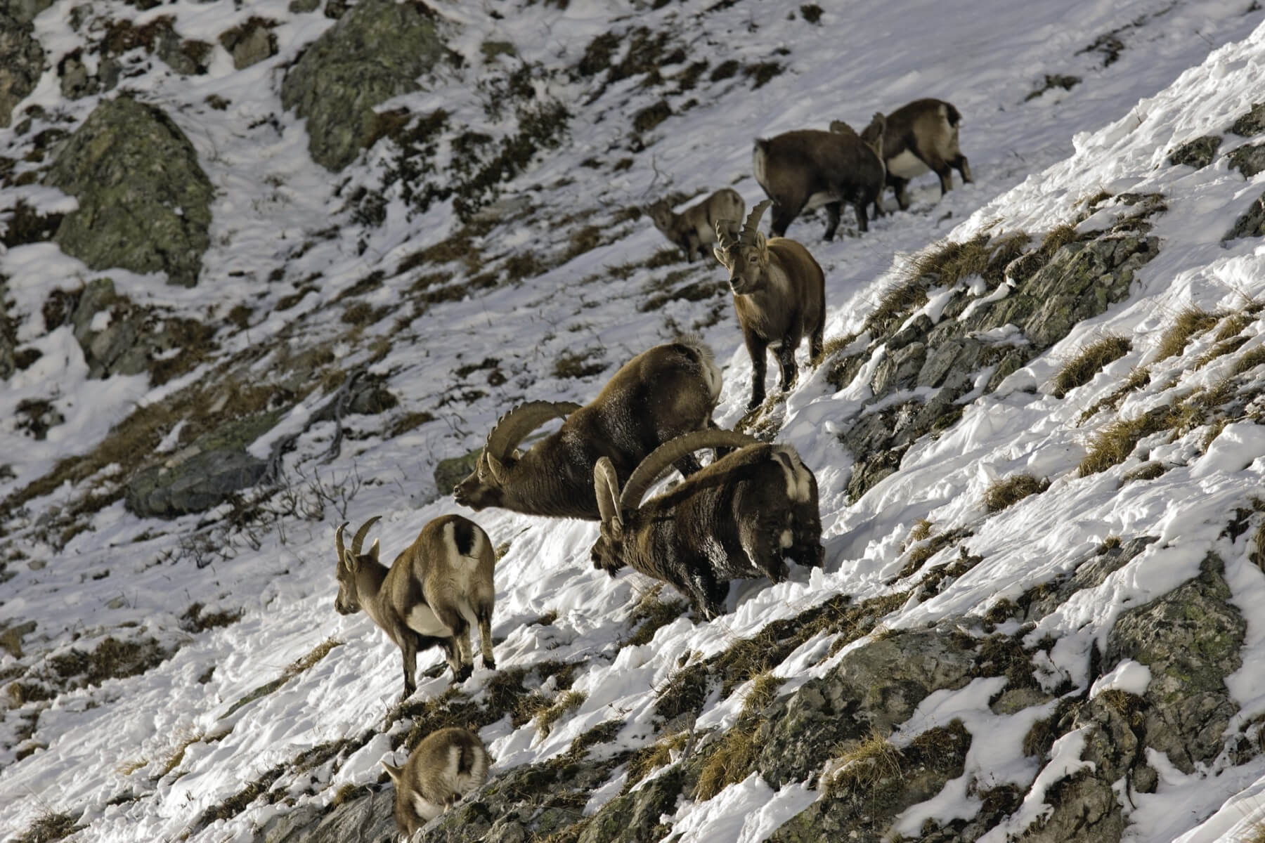 Depuis vingt ans, nous réservons dans notre agenda une priorité quasi sacrée au rut des bouquetins. Les amours de Capra ibex se déroulent autour du solstice d’hiver. Certes, il faut lutter contre le froid et déjouer les pièges de la montagne. Mais c’est sans conteste pour nous à cette période de l’année que les animaux sont les plus beaux. Dans leur robe sombre composée de quatre sortes de poils, les grands mâles de presque cent kilos sont tout aussi prêts à affronter l’hiver que leurs adversaires. Ils se déplacent dans ces falaises cristallines avec une aisance et un sang-froid déconcertants.