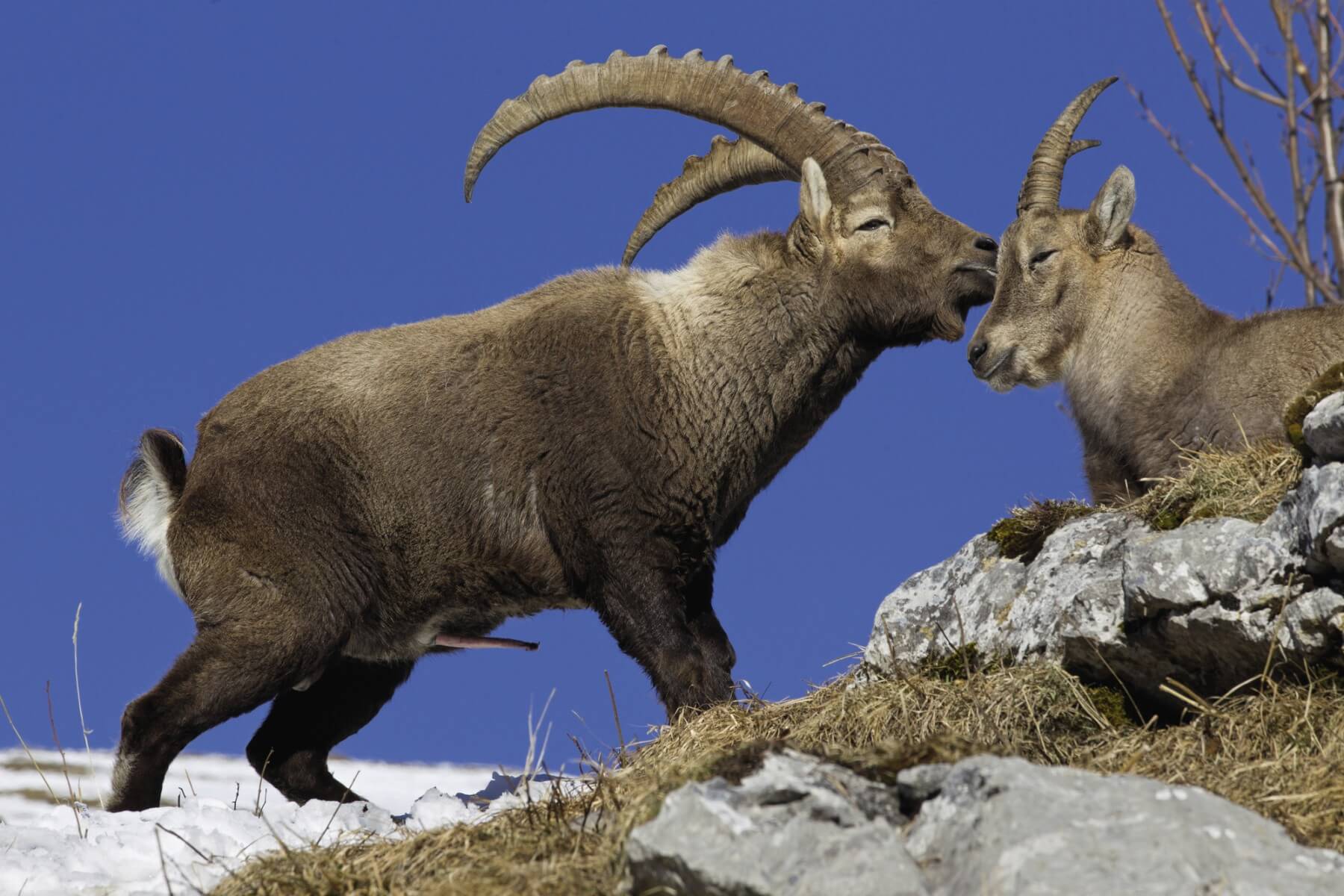 Le rut du bouquetin a lieu entre décembre et janvier. Mais les boucs anticipent l’établissement de la hiérarchie en s’affrontant à coups de cornes au printemps et en début d’été. Cela leur évite de gaspiller trop d’énergie en hiver. N’empêche : la suprématie du dominant, celui qui fécondera le plus de femelles, est souvent remise en question à la saison des amours. Duels et accouplements ont lieu sur des crêtes ou dans des falaises peu enneigées entre 2500 et 3000 m d’altitude.