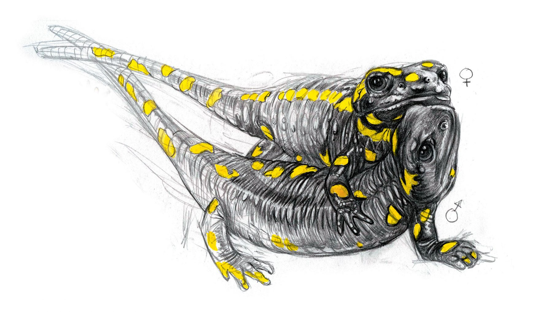 A défaut de percevoir leurs phéromones, comment est-il possible de distinguer une salamandre mâle d'une femelle ? Eh bien ce n'est pas évident ! Les mâles seraient un peu plus gros avec une tête légèrement plus massive. En été, leur cloaque gonfle et présente une fente longitudinale caractéristique. Mais bon, on ne va pas les retourner pour ça !