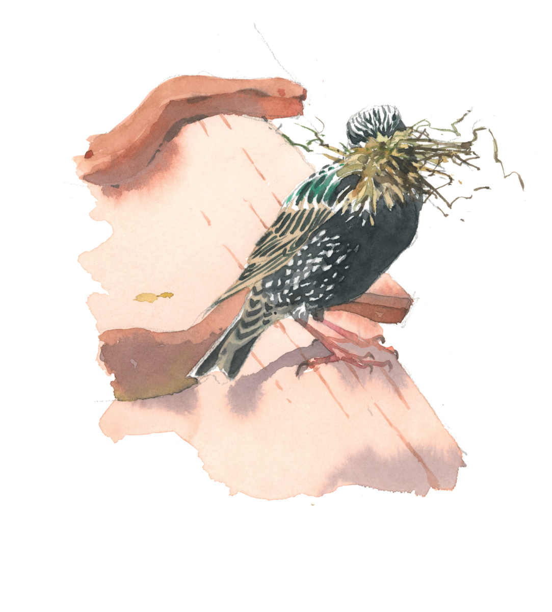 Deux étourneaux déjà appariés se faufilent sous une tuile du toit. Bienvenue, chers squatteurs !
