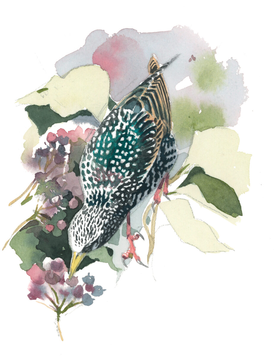 Ultra-commun, soit, mais vêtu d’un plumage fascinant si on prend le temps de l’admirer. Je braque la longue-vue sur celui qui se nourrit dans le lierre. De brun-noir à l’œil nu, l’aspect de cet étourneau devient iridescent à travers l’optique grossissante. Des reflets bronze, bleu, violet et vert se mélangent aux minuscules points blancs qui constellent son corps couleur nuit. J’y vois une aurore boréale dans un ciel étoilé !