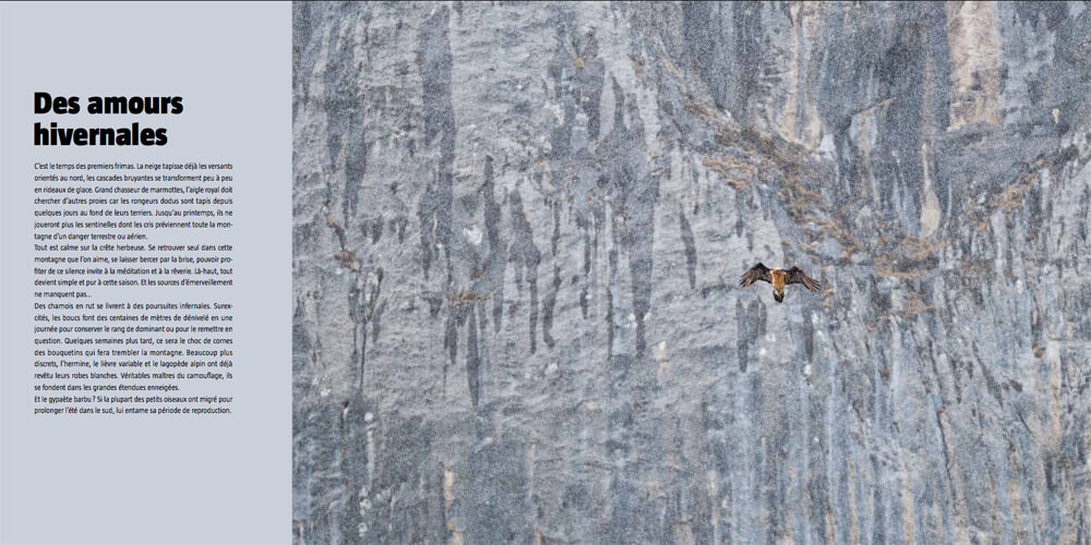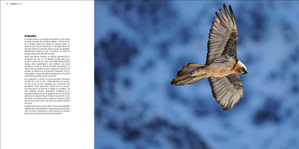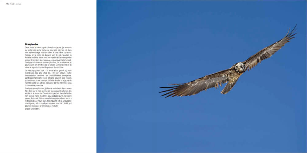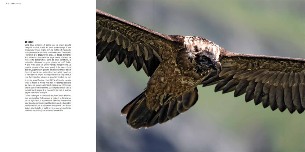 Pour rendre hommage à ce rapace légendaire et fêter les 30 ans de son retour, La Salamandre vient de publier L’envol du gypaète, le quatrième volume de sa collection de livres photo Histoires d’images. Au fil des 144 pages, les auteurs Antoine Rezer et Jean-Luc Danis, l’un Haut-Savoyard et l’autre Savoyard, partagent leur passion et leur connaissance de cet oiseau. Des parades hivernales jusqu’au grand jour de l’envol, leur témoignage exceptionnel est illustré par des images à couper le souffle et retrace le cycle de vie sur une année. Toujours attentifs à éviter tout dérangement de ce rapace qui demeure encore vulnérable, les photographes présentent également des images inédites de comportements jusqu’ici rarement immortalisés dans la nature.