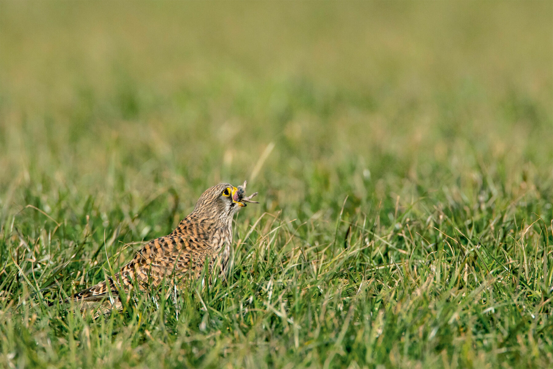 La luminosité augmente rapidement, mais le petit rapace restera-t-il assez longtemps pour être immortalisé dans la clarté du levant, parmi les baies rouges ? J’évite tout bruit, tout mouvement brusque, pour ne pas l’effrayer. Confiant, il attend là jusqu’à ce que l’aurore lui permette de repérer sa proie. Tout à coup, l’oiseau plonge avec détermination dans l’herbe rase au pied de la haie. Je ne vois pas si le faucon, en partie caché, a réussi son coup. Il ne s’envole pas tout de suite, c’est bon signe : le petit déjeuner est servi ! Quelques minutes plus tard, il avale tout rond le reste de son festin.