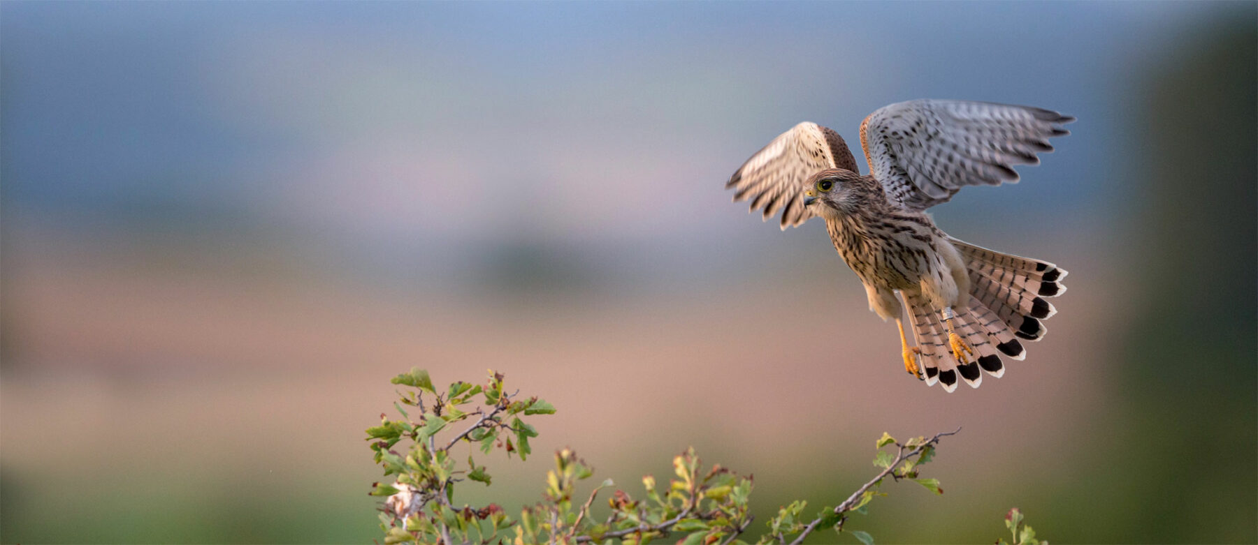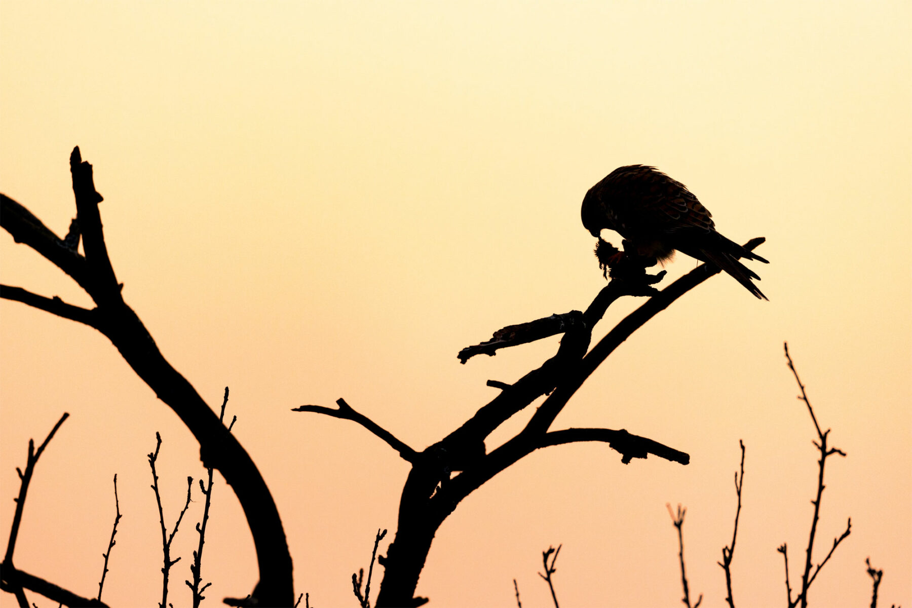 Animé d’un bel élan, j’ai hâte de sortir ce matin. J’espère revoir le faucon crécerelle repéré ces derniers jours dans une haie, en quête de campagnols à se mettre sous le bec. Je m’installe incognito dans mon affût, avant le lever du jour. L’oiseau arrive alors que je suis à peine en place. Sa silhouette au sommet d’une aubépine en fruits se découpe en ombre chinoise sur l’horizon qui commence à rougir. Clic ! Premières images !
