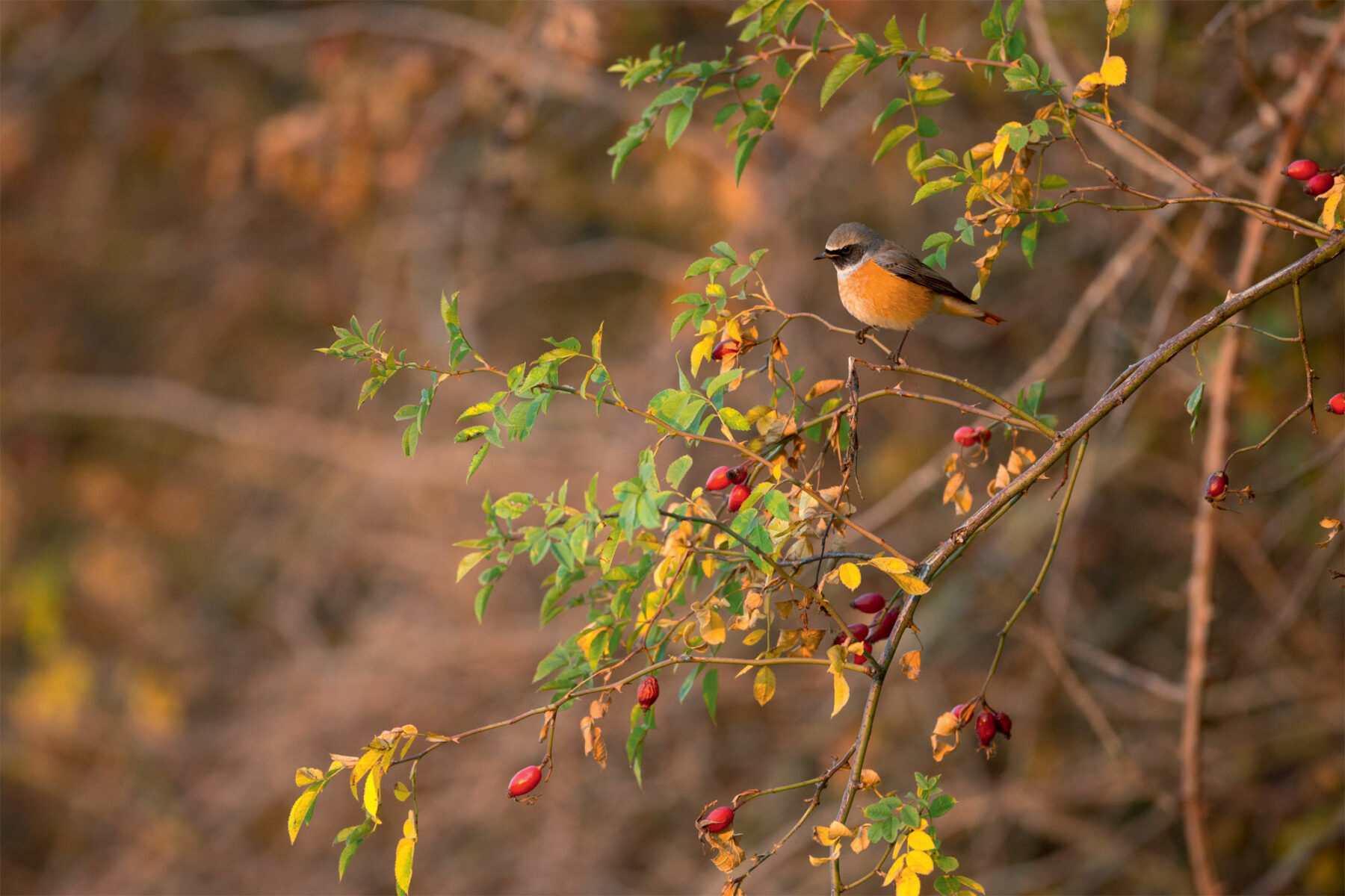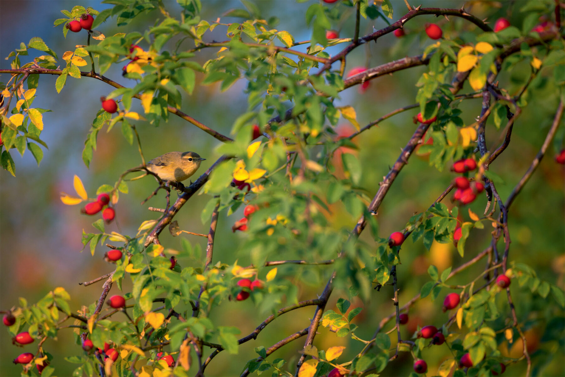 Cette abondance n’a pas échappé aux oiseaux migrateurs de passage dans la région. Après une nuit de vol plein sud, il est temps pour eux de reprendre des forces. De ma cache, j’observe fauvettes, rougequeues à front blanc, pouillots véloces et bien d’autres espèces gober par dizaines les petites baies colorées. Ils vont festoyer ainsi quelques jours et reconstituer des réserves de graisse nécessaires pour couvrir la longue distance qui les sépare de leurs quartiers d’hiver. Cette manne essentielle profite également aux mammifères : renards, loirs et muscardins attendent la nuit pour s’en délecter en toute discrétion.