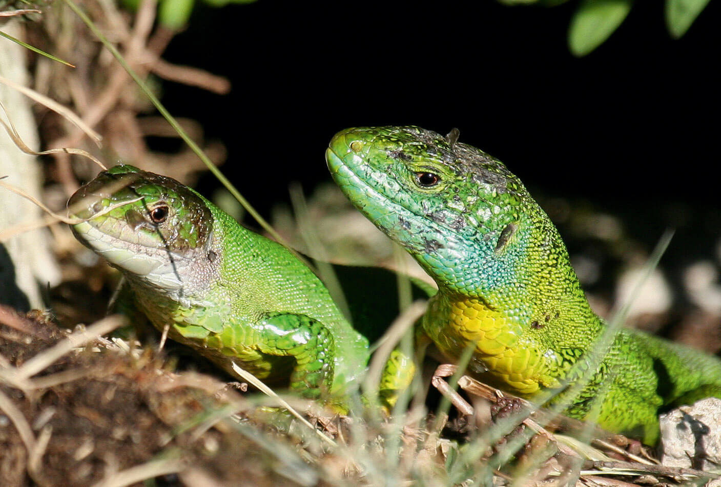 Des travées entretenues par le bétail communal permettent de s’immerger dans un labyrinthe de bourgeons, d’épines et de fleurs blanches. A pas feutrés, approchons ce nid d’herbes jaunies par l’hiver, tapissé de feuilles mortes et matelassé d’une mousse vert dru. Plein soleil, presque midi, vent nul. C’est l’endroit idéal pour surprendre le petit varan local. Là ! Un beau mâle de lézard vert, presque fluorescent avec sa gorge d’un bleu ostentatoire.