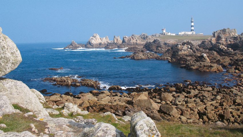 - Suivre le littoral jusqu’au dédale granitique de la pointe de Pern (2), qui se prolonge par le phare de Nividic et ses deux pylônes.