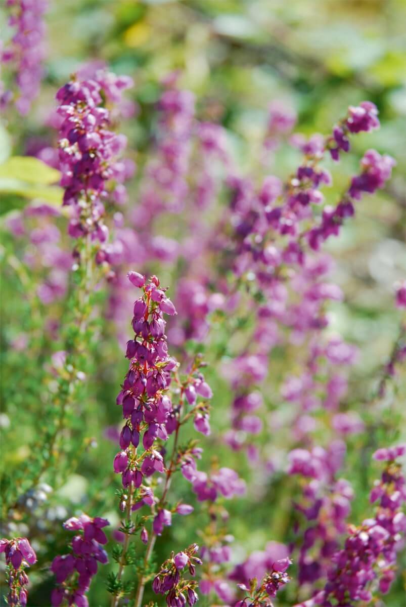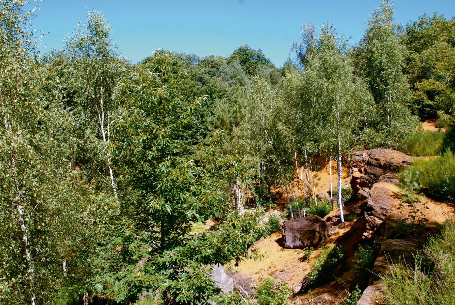 Changement de décor radical dans la carrière ombragée. Un parfum de genêt émane de ce paysage aux sables ocre dignes du Colorado. Le long du sentier poussent des germandrées scorodoines – une plante mellifère – et des jasiones des montagnes, dont les capitules forment de jolis pompons mauves. Le front de taille, lui, a été colonisé par une végétation pionnière : bouleau verruqueux, pin maritime… Les chatons jaunâtres des châtaigniers forment sous le pied un tapis cotonneux. Myrtils et piérides s’attardent sur la bruyère cendrée en fleur. La callune, qui s’en distingue à ses petites écailles, ne fleurira que fin août.