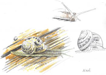 C'est un petit-gris, un modèle bien proportionné avec une coquille vaguement zébrée de noir, de brun et de blanc nacré. Il est totalement dans la norme avec sa tenue dextre et ses lignes qui tournent dans le sens des aiguilles d'une montre. Je suis épaté par la géométrie parfaite de sa maison en pierre, ou plus exactement en carbonate de calcium. Je me dis qu'il ne doit pas manquer de calcaire dans ce petit coin du Jura.