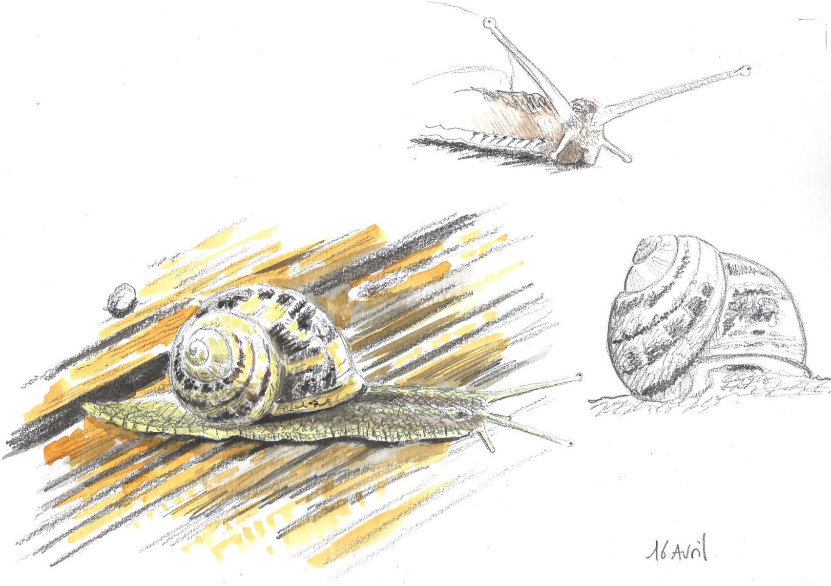 C'est un petit-gris, un modèle bien proportionné avec une coquille vaguement zébrée de noir, de brun et de blanc nacré. Il est totalement dans la norme avec sa tenue dextre et ses lignes qui tournent dans le sens des aiguilles d'une montre. Je suis épaté par la géométrie parfaite de sa maison en pierre, ou plus exactement en carbonate de calcium. Je me dis qu'il ne doit pas manquer de calcaire dans ce petit coin du Jura.