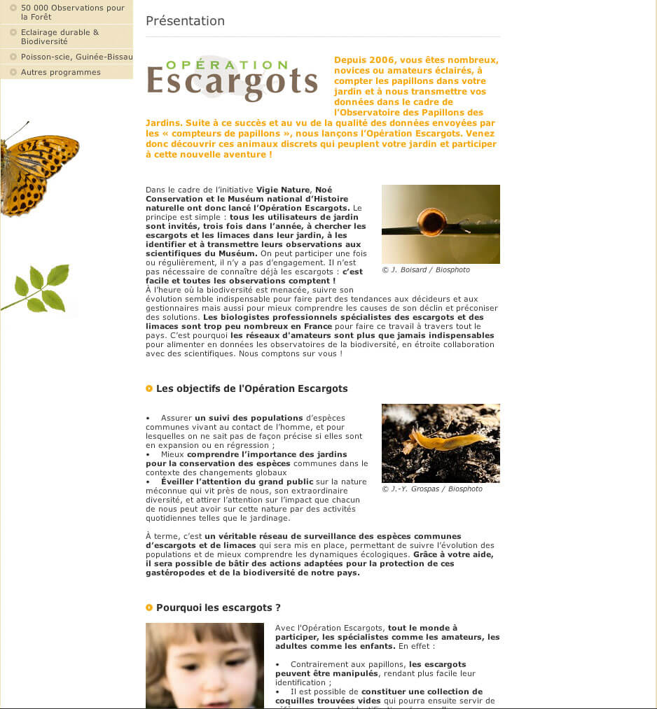 En France, Noé Conservation et le Muséum national d'histoire naturelle vous proposent de participer à l'Opération escargots. De quoi s'agit-il ? D'évaluer la biodiversité en mollusques de votre jardin ou d'un autre endroit que vous fréquentez volontiers. Tout le monde peut participer, adultes ou enfants, spécialistes ou débutants. Un guide des espèces, des fiches d'identification et d'autres outils disponibles en ligne vous permettront de devenir de vrais experts. En saisissant vos observations dans une base de données nationale, vous participerez à une meilleure connaissance de la situation de 31 escargots et limaces.