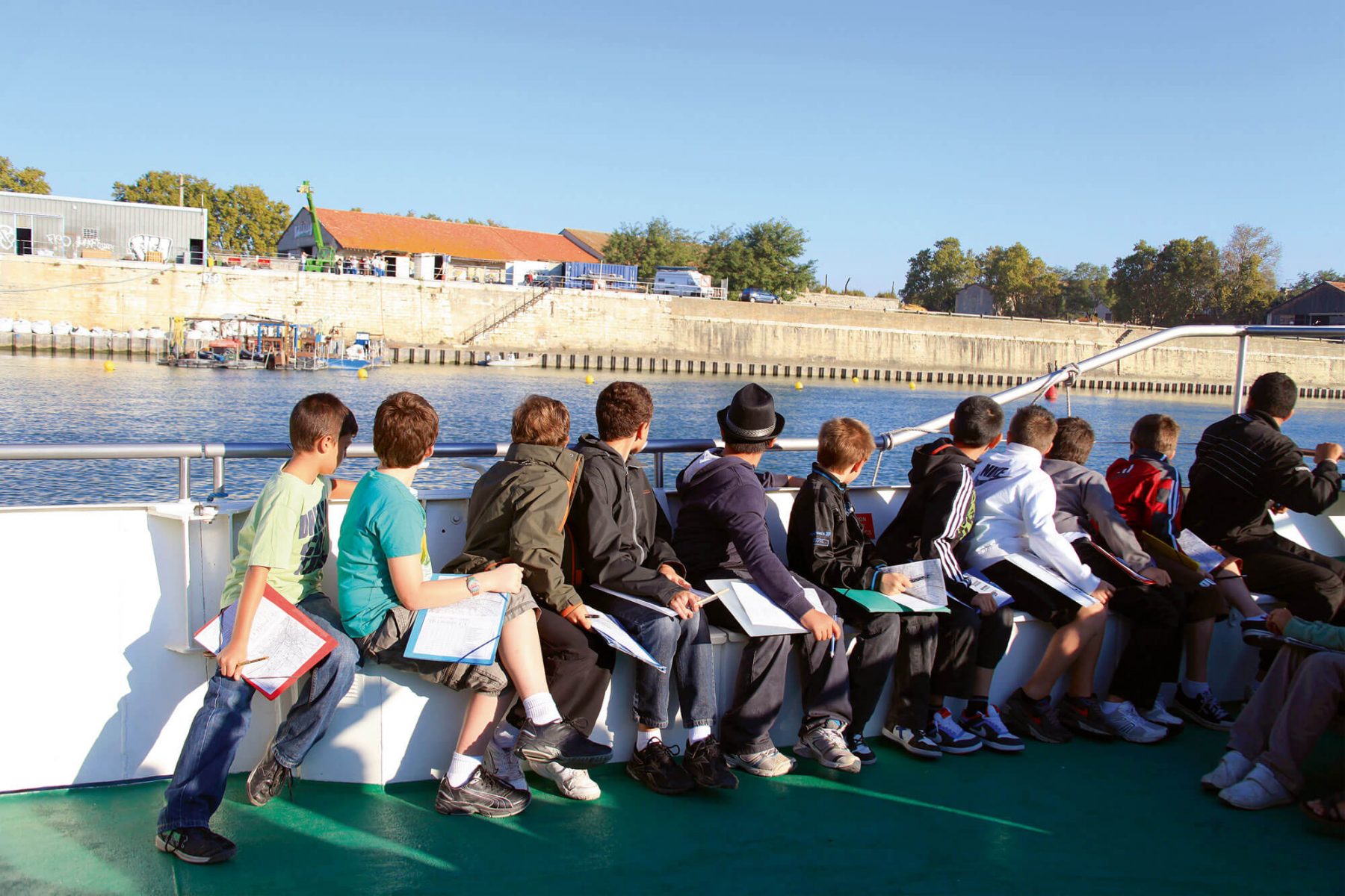 au- dessus de la cabine. Les têtes sont levées, bouche bée. Les enfants observent cette nature inconnue dans laquelle se sont étroitement imbriquées les activités humaines : constructions navales, carrières, aires touristiques... A côté de l'embarcation, un petit îlot accueille quelques aigrettes. Les oiseaux dorment. « Là, au moins, ils sont protégés des renards. »