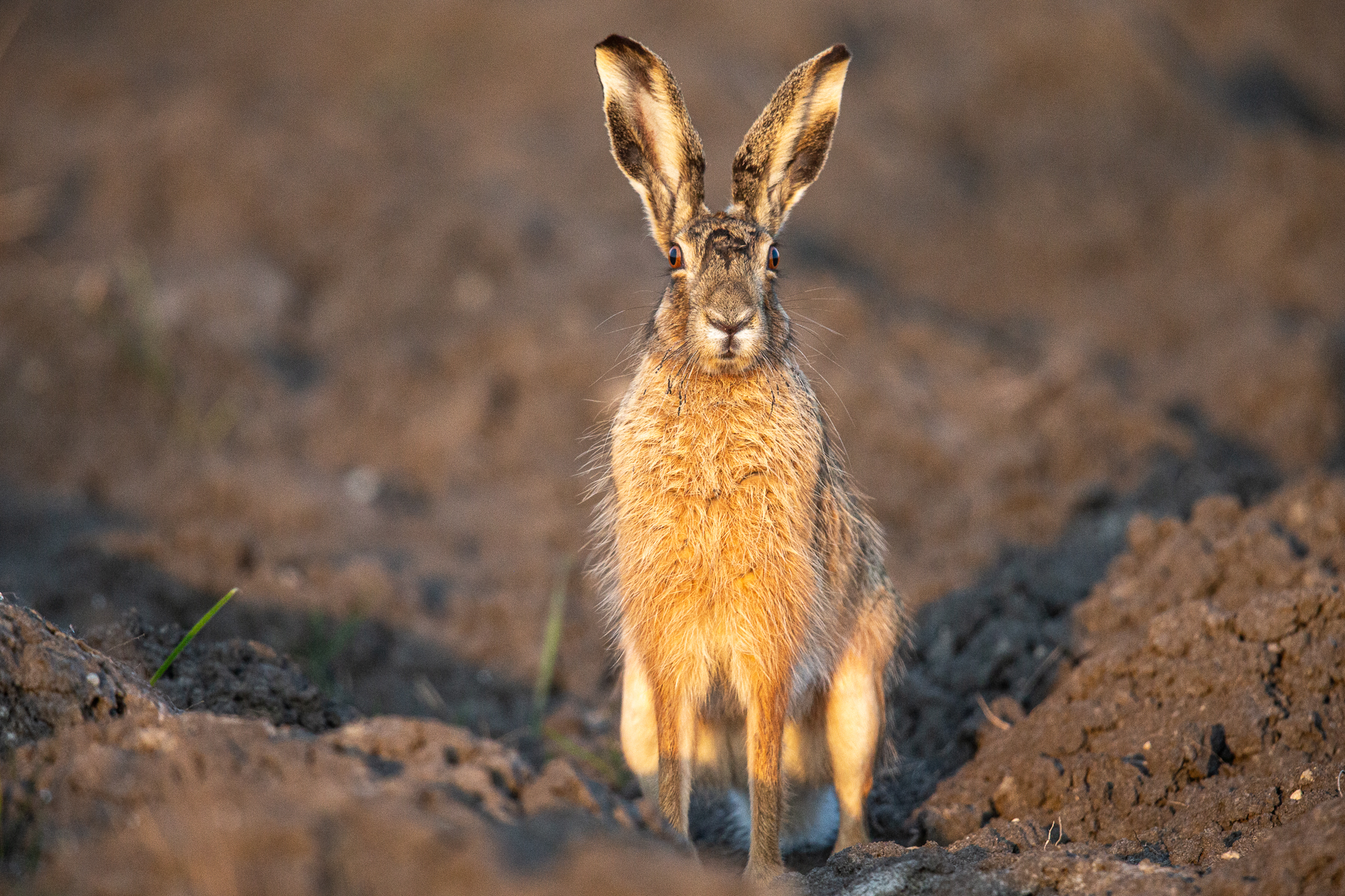 Au lever du jour, une motte de terre se réveille au milieu du champ labouré face à moi. Je souris : j’avais attentivement jumelé la campagne sans pourtant repérer le discret mammifère tapi bien au fond d’un sillon. Le lièvre brun se dresse maintenant sur ses pattes arrière et observe les alentours. Puis, rassuré, il bondit vers la haie où je l'attends planqué entre une aubépine et une viorne. Je l'attends avec l’œil collé au viseur.