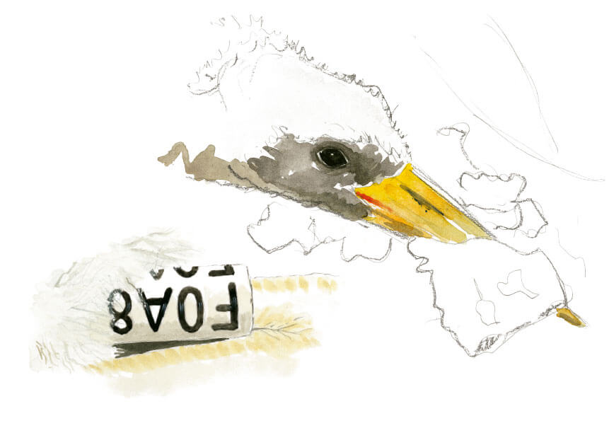 Damien passe une corde autour d’une branche solide. Puis il se hisse jusqu’au nid et prélève les jeunes dans un sac avant de les faire descendre au sol. Frédéric mesure, pèse, ausculte et surtout bague chacun des gros poussins bigarrés. Sans oublier de prélever une plume pour faire parler la génétique.