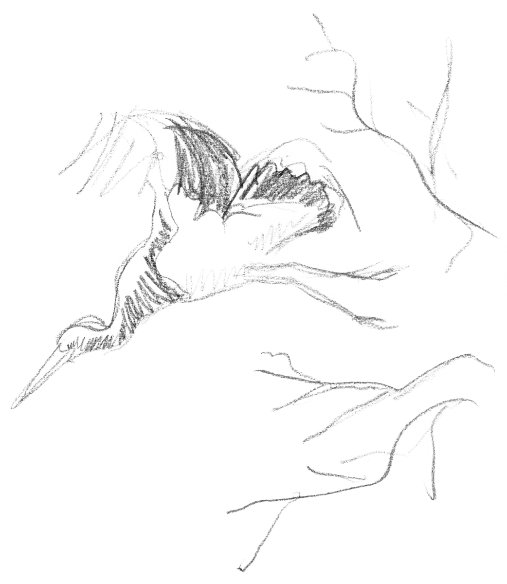 11 juillet L’été s’est installé. L’air est moite et le sous-bois assombri par le feuillage dense. Dans une flaque d’ornière, l’eau vibre devant mes pas. Des sonneurs à ventre jaune nagent pour me fuir. Encore un fossé envahi de fougères aigles à franchir et me voilà sur le chemin adopté par l’un des cigogneaux pour faire ses exercices de vol. Il est là, à quelques centaines de mètres de son nid, occupé à muscler ses ailes en enchaînant des petits vols.