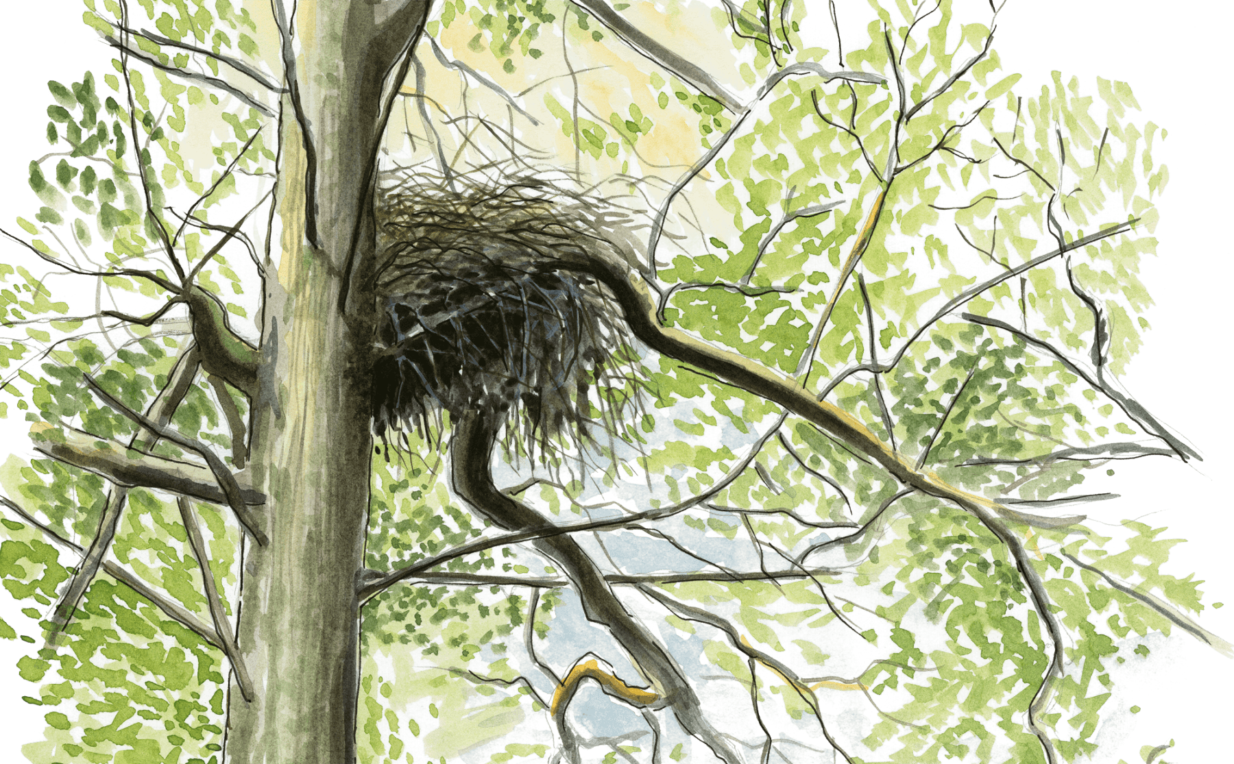 6 mars La voûte des grands arbres m’invite à entrer dans la forêt. En guise de tapis rouge, il y a les feuilles mortes de l’année passée. Le sous-bois est encore nu et la vue porte assez loin. Mais plus j’avance et plus mes pas se font prudents. Comme un Indien, je vise la mousse et la terre nue pour ne pas faire craquer les brindilles. Bientôt, j’aperçois le tronc d’un vieux bouleau étendu par terre comme pour me barrer le chemin. Juste derrière, un chêne robuste porte à flanc de tronc un impressionnant amas de branches. Enfin, le nid de la dame noire ! Depuis quinze ans, je rêve de cet instant. J’ai devant moi l’une des demeures les plus secrètes de la nature. Mais aussitôt mes tempes martèlent une question obsédante : que fais-tu ici, intrus ?