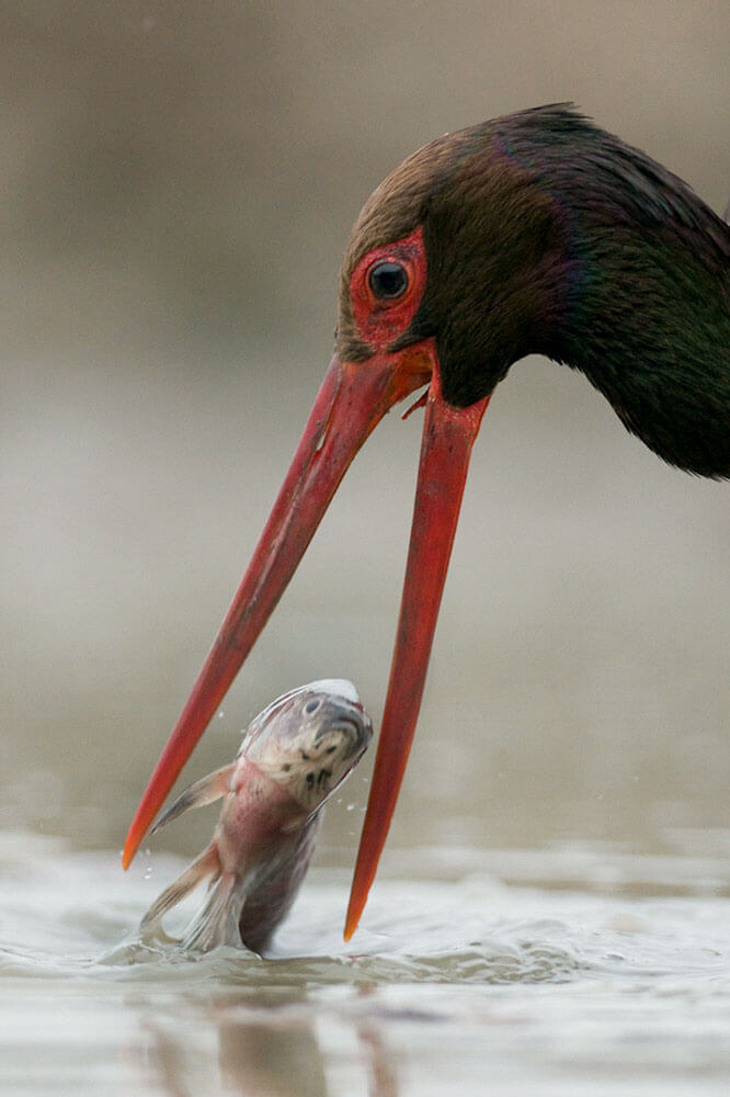 Le territoire de la cigogne noire ne se limite pas au sanctuaire choisi pour son nid. Pour nourrir ses jeunes, elle a besoin de très nombreux sites de pêche. Des suivis par satellite en Bourgogne on montré qu’un couple peut exploiter 800 km2, soit un rectangle de 40 sur 20 km. Les adultes utilisent surtout un secteur de 2 km autour du nid pendant la couvaison. Puis, au fur et à mesure que les jeunes grandissent, ils osent s’éloigner toujours plus.
