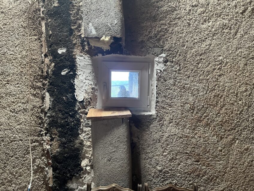 Accessible depuis le grenier de la maison, la lucarne en question avait été murée avant l’emménagement des Laumonier, il y a quatre ans. C’est donc depuis ses espaces extérieurs que le trio a d’abord constaté l’installation, deux années de suite, d’un couple de faucons. Ornithologue amateur et membre du groupe local Chaîne des Puys de la Ligue pour la protection des oiseaux (LPO), Mickaël a ensuite entrepris des travaux dans le fameux grenier. Il perce d’abord le mur pour y installer une vitre sans tain, lui permettant de voir le nid sans être vu des oiseaux. « Cette année, papa a fait une vitre un peu mieux », s’empresse de préciser Raphaël, complété par le principal intéressé. « La vitre a très vite été salie par les déjections des petits. Alors, cette année, j’ai installé une fenêtre, qu’on peut ouvrir en fin de saison pour nettoyer. »