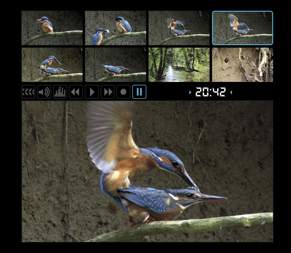 Un couple de martins-pêcheurs s’accouple sur l’un de ses perchoirs favoris. Un plan difficile ? « L’accouplement est très rapide. C’est l’un des comportements que je souhaitais absolument avoir. Dans cette séquence d’images, on peut remarquer que le mâle est en plein creusage du terrier, car son bec est sali de terre. On voit aussi comme il tient la femelle en pinçant les plumes de sa tête et en s’appuyant avec les pattes. Après son départ, le plumage du dos de sa partenaire reste ébouriffé pendant un moment. Sur le terrain, c’est un signe très fiable que l’accouplement vient d’avoir lieu. A la même période, j’ai observé un manège particulier de la femelle. Alors que d’habitude elle sort comme une bombe du terrier, il arrive à la saison des amours qu’elle guigne depuis l’entrée, s’envole et revienne ensuite après une boucle de quelques mètres. Peut-être une sorte d’invitation nuptiale pour le mâle. »