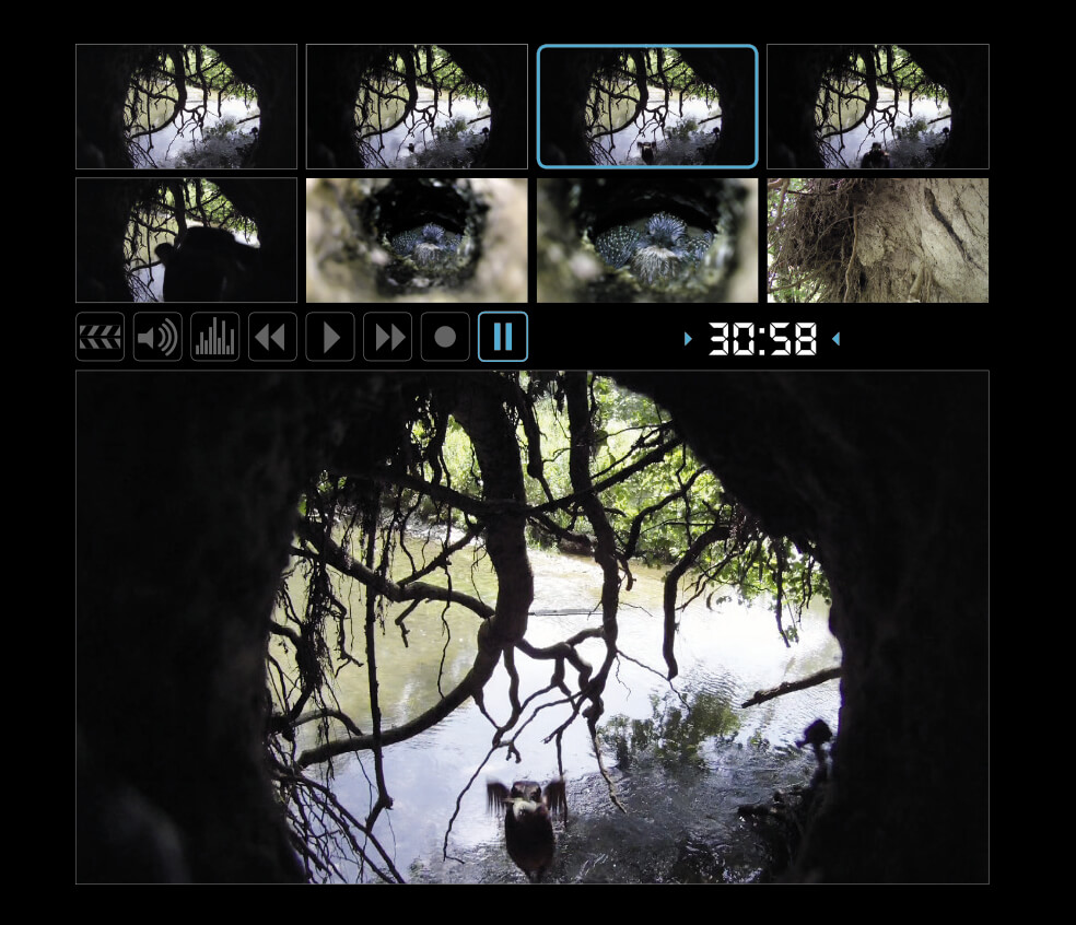 « Non, quand même pas ! Pour montrer ce que l’oiseau voit lorsqu’il vole au ras de l’eau, j’ai utilisé une tyrolienne. Pendant mes vacances d’été, avec l’aide de la stagiaire Marie Amiguet, nous avons tendu un câble en acier de 30 m en diagonale entre deux rives de la Venoge. Après quelques heures de réglage et une trentaine de ratés, nous sommes parvenus à une bonne simulation du vol d’un martin-pêcheur. Pour éviter de déranger le couple qui nichait encore courant juillet dans le secteur, j’ai creusé moi-même un faux nid dans la berge, là où l’objectif de la caméra arrivait après sa glissade… »
