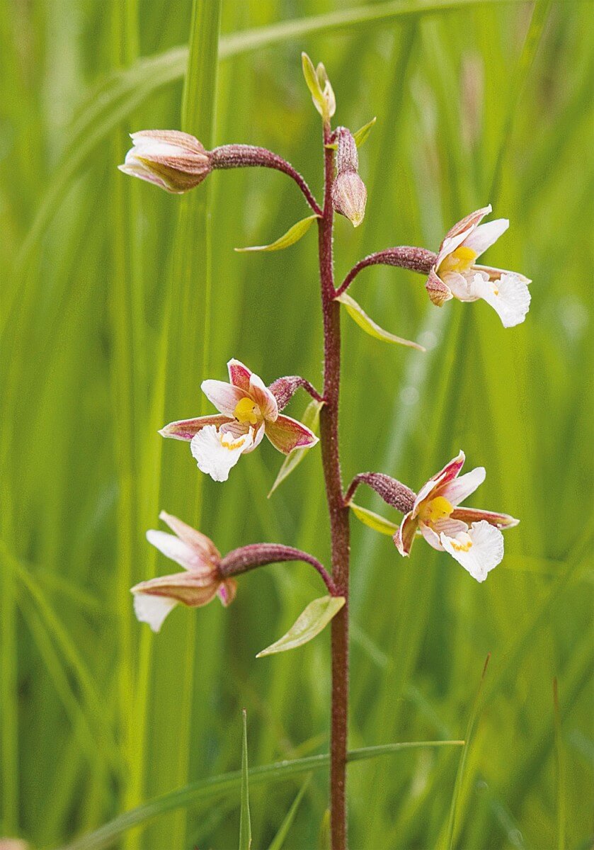 Ouverture. La frondaison se déchire faisant place au ciel. Le chemin s’élargit, lumineux. De part et d’autre la forêt s’est retirée. Dans la dépression à peine perceptible, l’humidité est trop élevée pour les ligneux. Laîches, choins et joncs s’étendent dans cette clairière providentielle. En lisière, pins sylvestres, bouleaux et genévriers soulignent la transition vers la forêt. Un enchantement ! Ici et là, quelques notes de couleur : les grandes draperies jaunes de l’iris des marais et, plus discrètes, les étoffes chatoyantes couleur crème, pourpre sang, rose lilas ou vert olive d’une multitude d’orchidées. Inutile de se mouiller les pieds dans les prairies détrempées, les belles s’offrent le long du chemin. Il suffit de baisser les yeux.