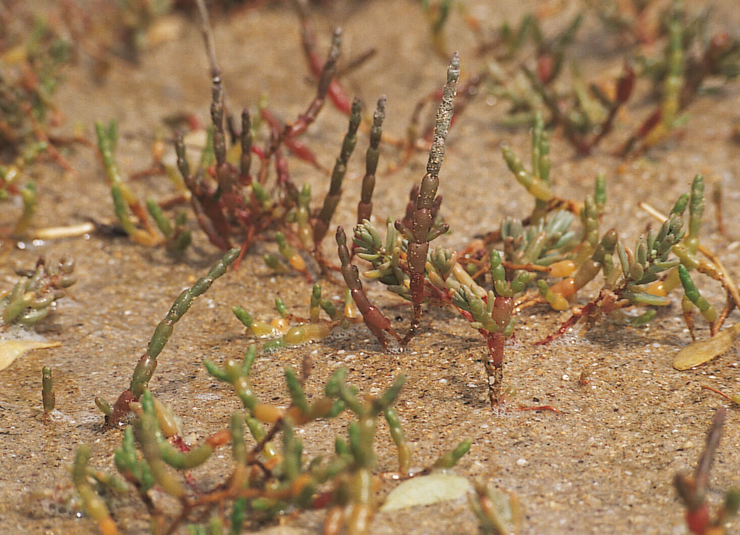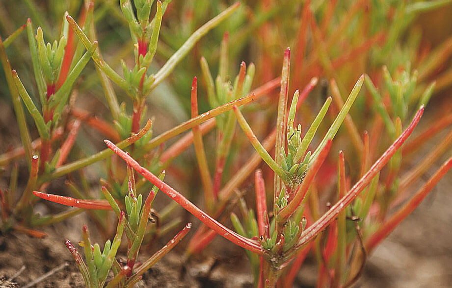 Guère plus haute qu’une pomme, la salicorne piquette les vases nues du littoral. Ses tiges boudinées rougeoient à l’automne, et ses ramifications lui donnent l’allure d’une prêle ou d’un petit sapin. La salicorne est pourtant une véritable plante à fleurs : minuscules, celles-ci se cachent à la base de chaque boursouflure. Cette plante comestible se déguste au vinaigre, façon cornichons.