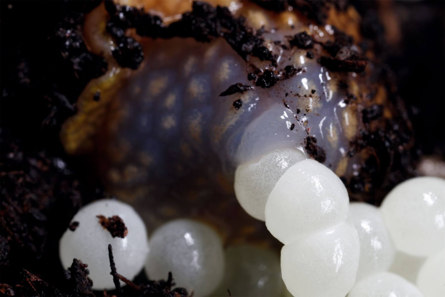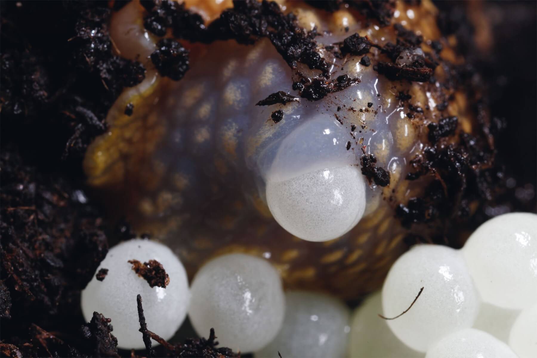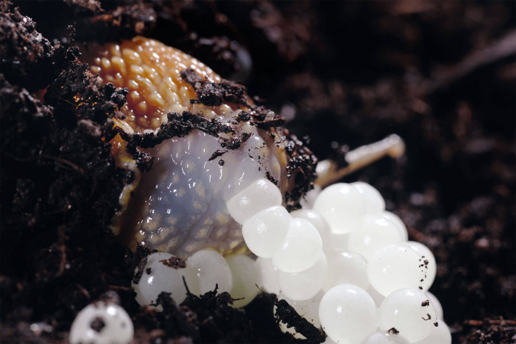 Après une pause bienvenue, le mollusque commence à expulser ses œufs les uns après les autres. Tous les quarts d'heure, toutes les demi-heures parfois, il libère sur le côté de sa tête une perle blanche de la taille d'un petit pois. Et cela peut durer ainsi une dizaine d'heures. Au fil du temps, la ponte s'égrène en chapelet au fond du nid. Puis la bête épuisée fait une nouvelle longue sieste avant de remonter lentement en bouchant son tunnel. Bravo, mission accomplie !